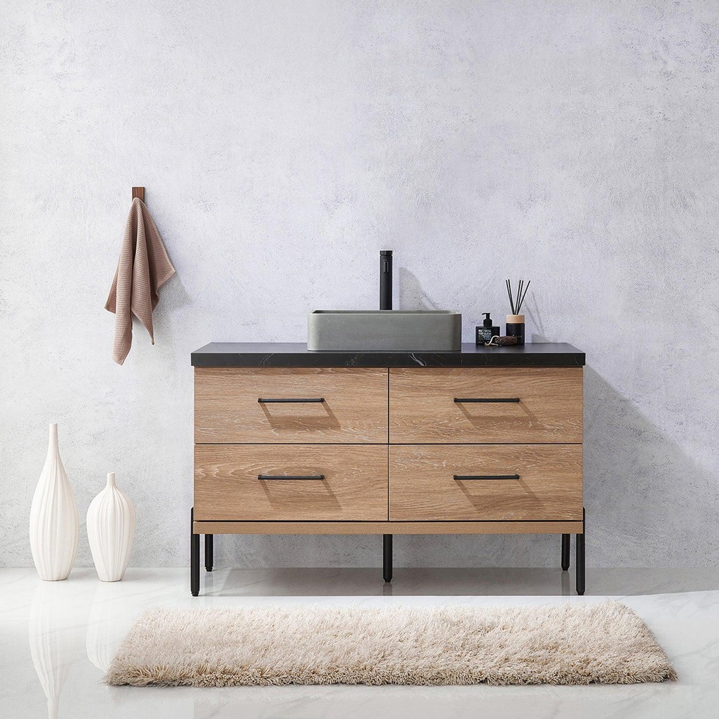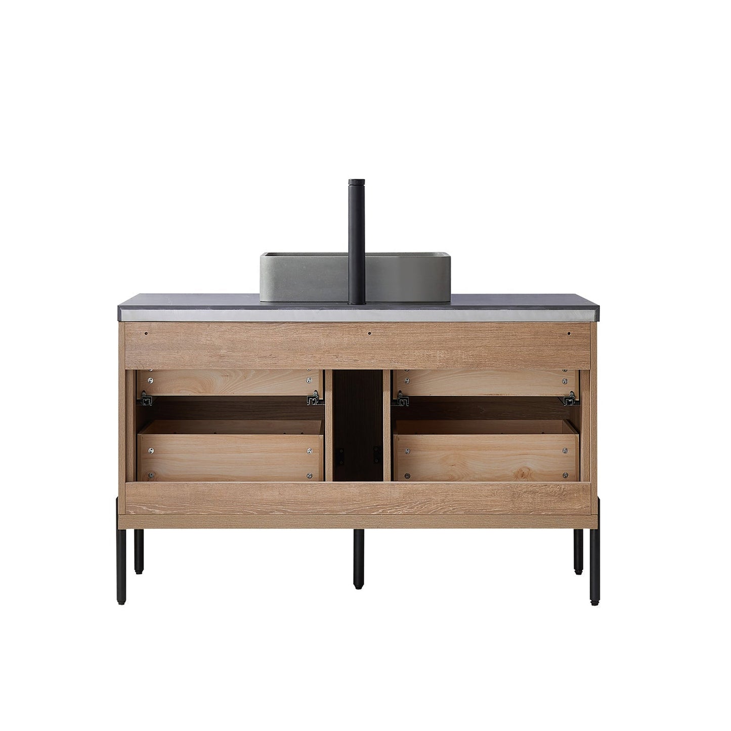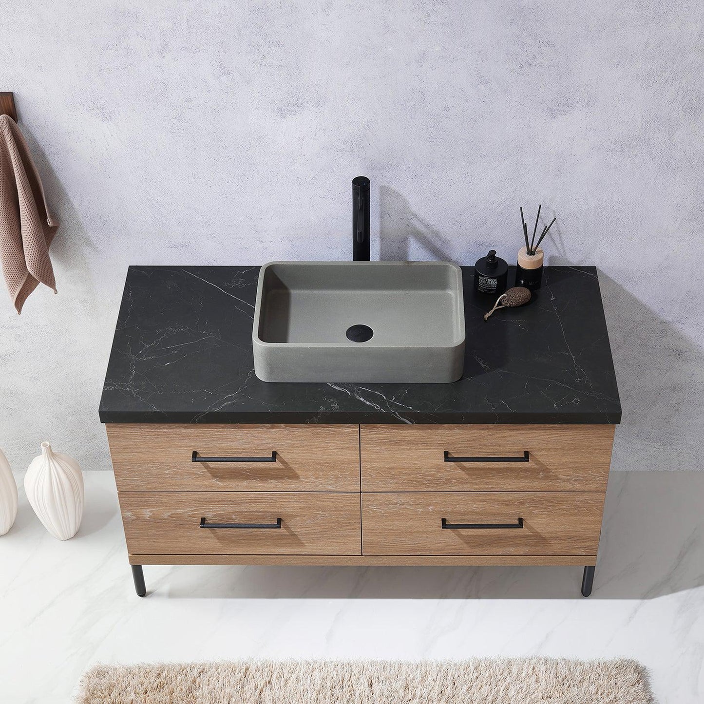 Vinnova Trento 48" Single Sink Bath Vanity In North American Oak With Black Sintered Stone Top With Rectangular Concrete Sink