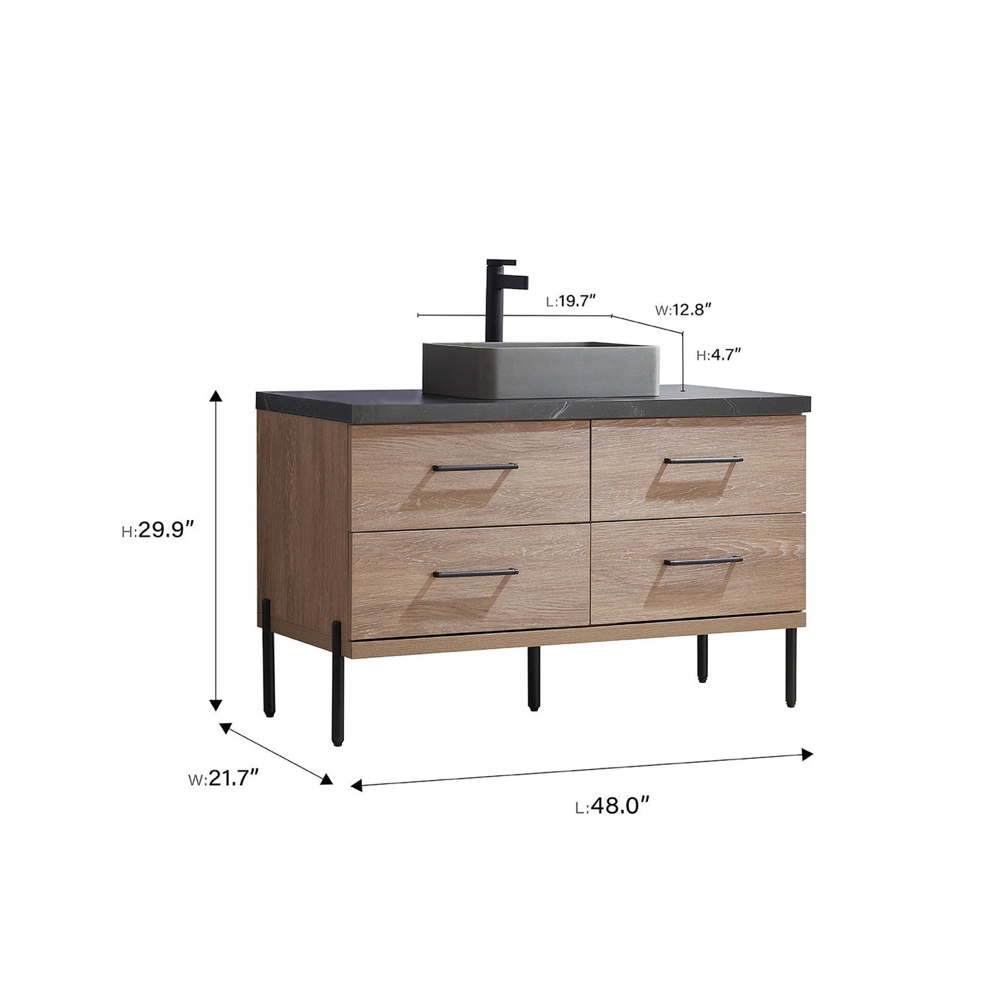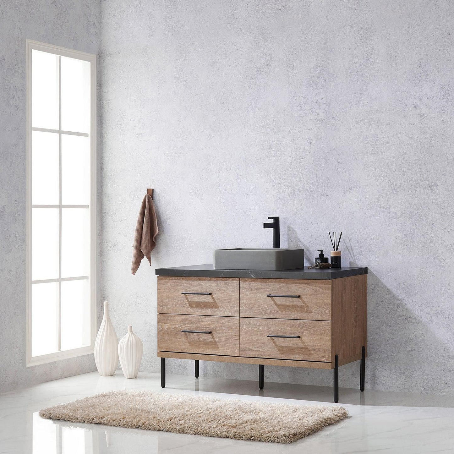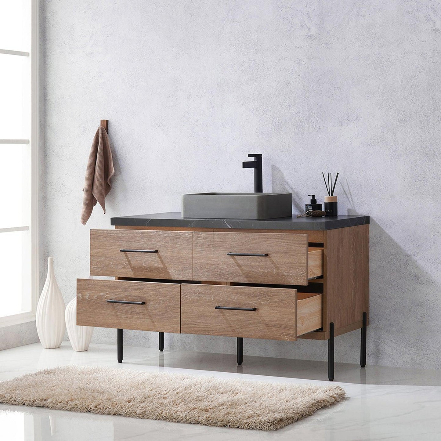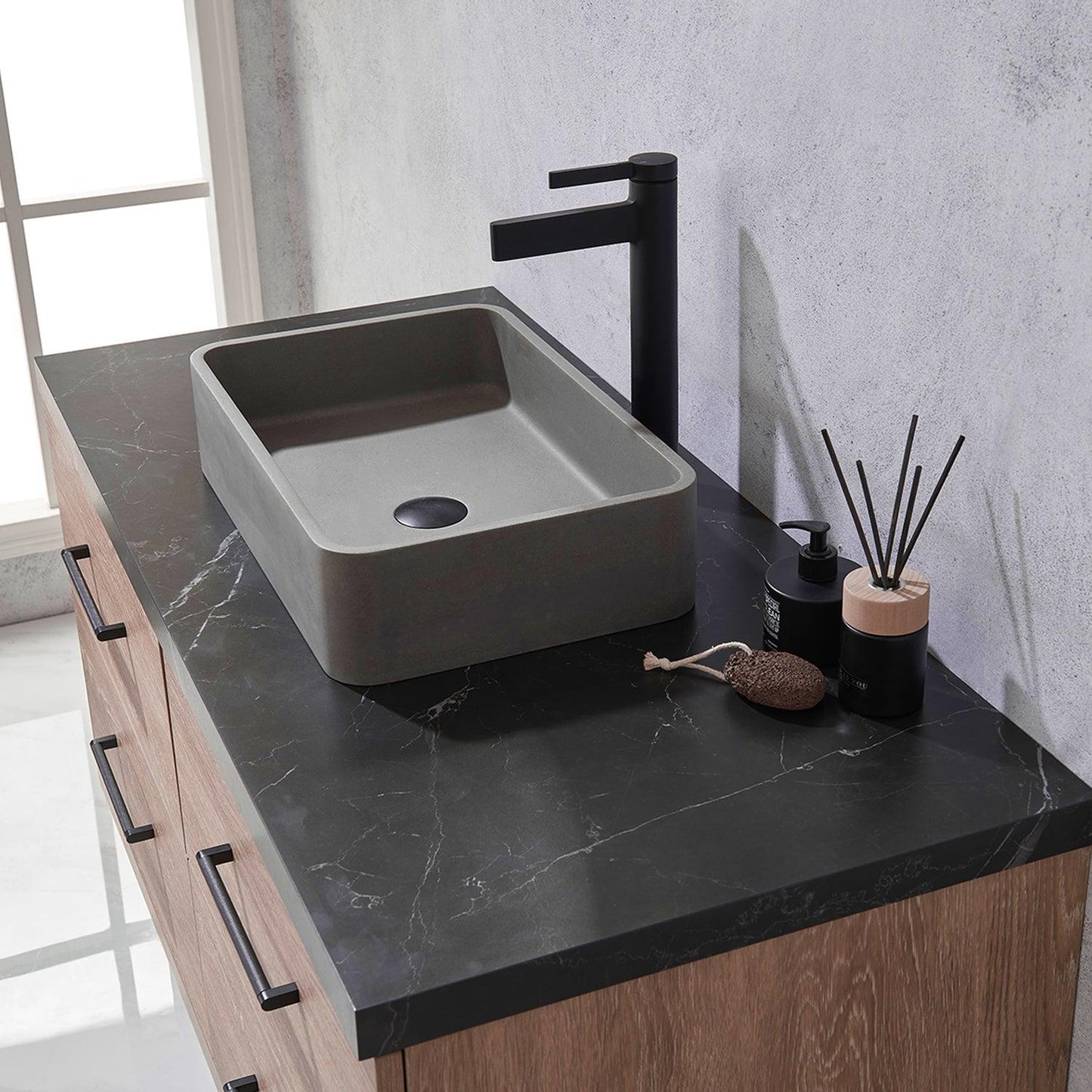 Vinnova Trento 48" Single Sink Bath Vanity In North American Oak With Black Sintered Stone Top With Rectangular Concrete Sink