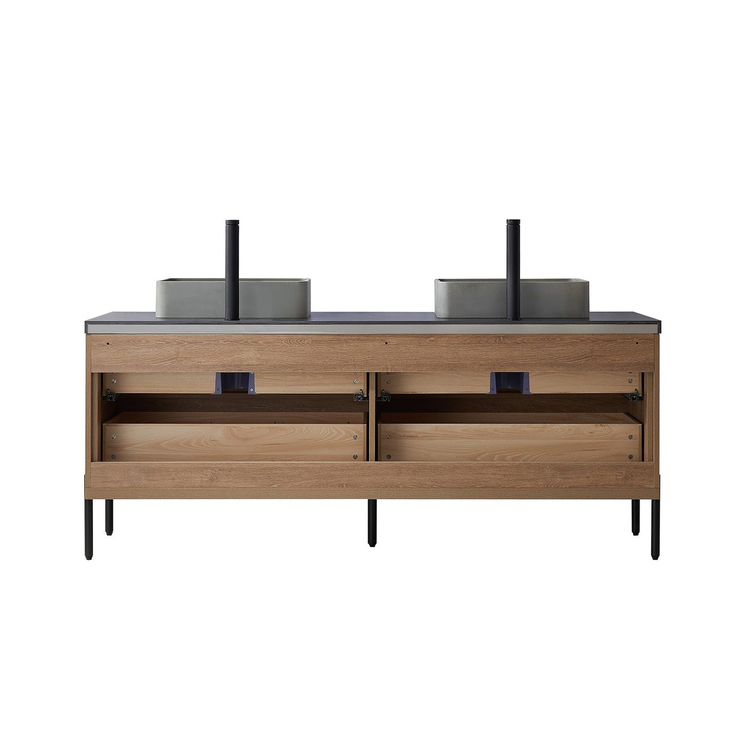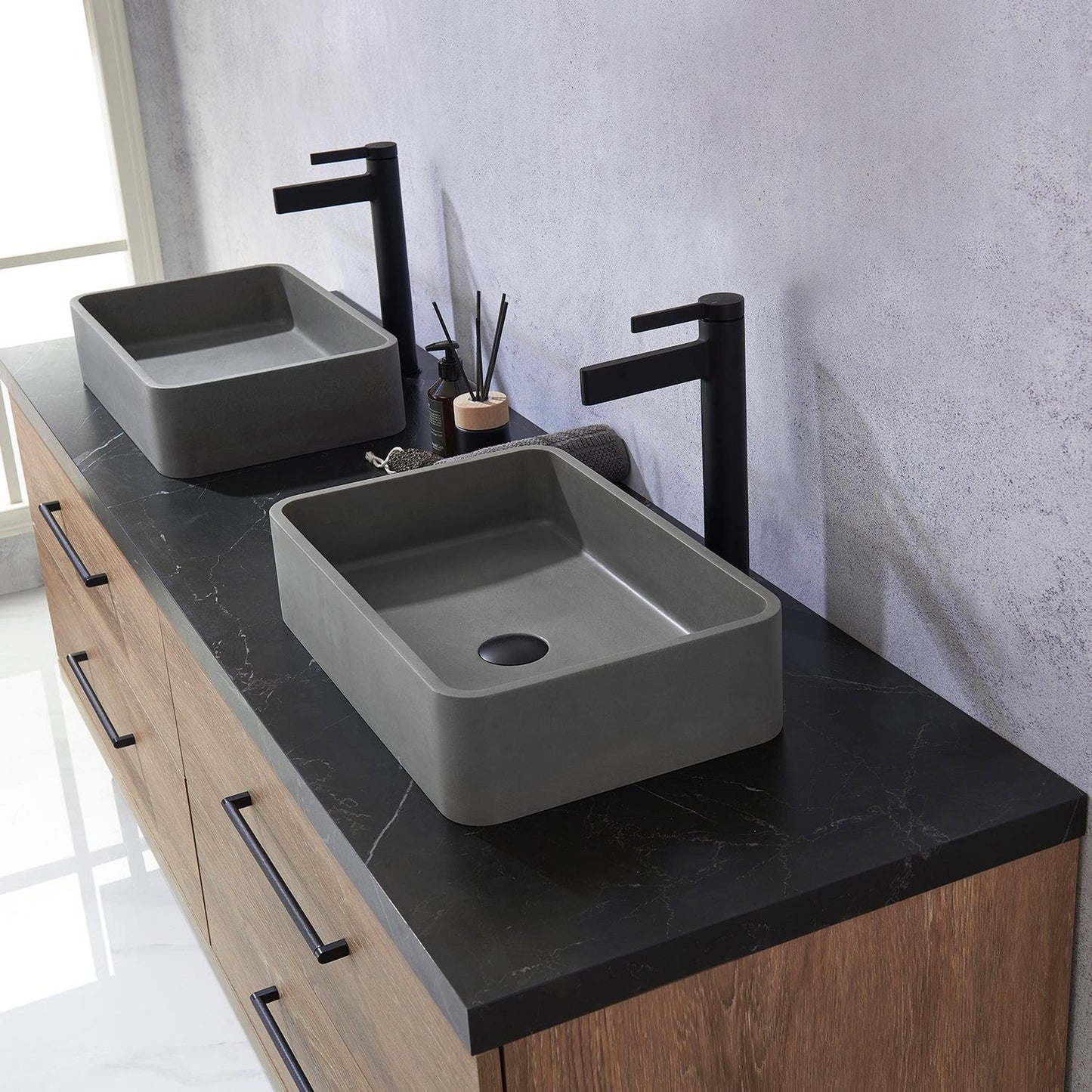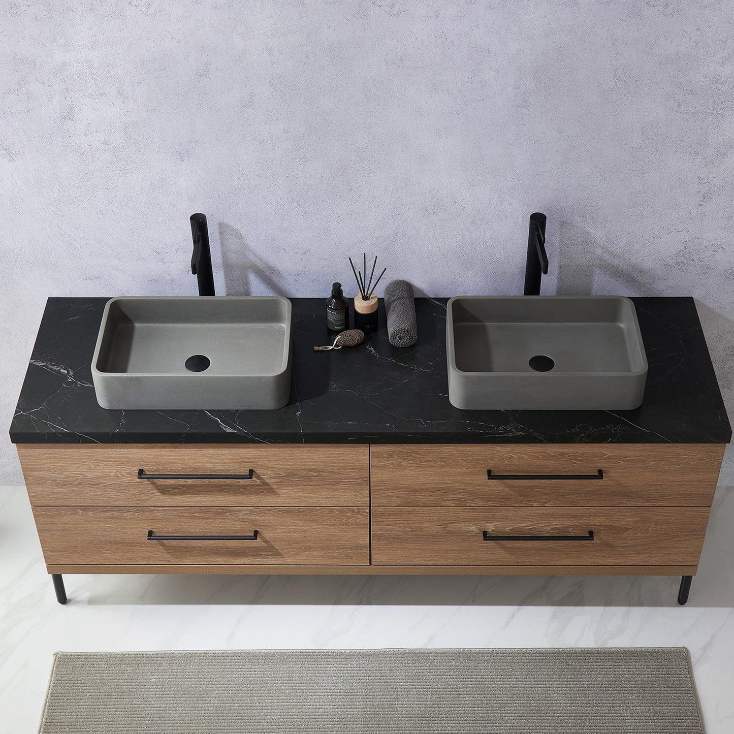 Vinnova Trento 72" Double Sink Bath Vanity In North American Oak With Black Sintered Stone Top With Rectangular Concrete Sink