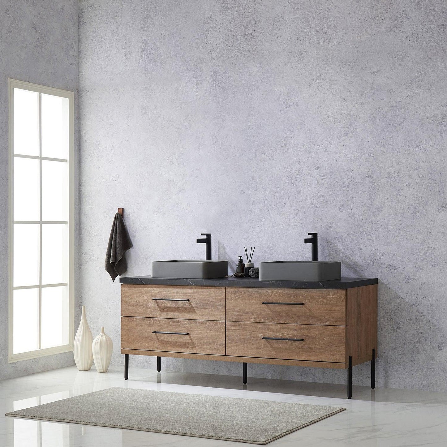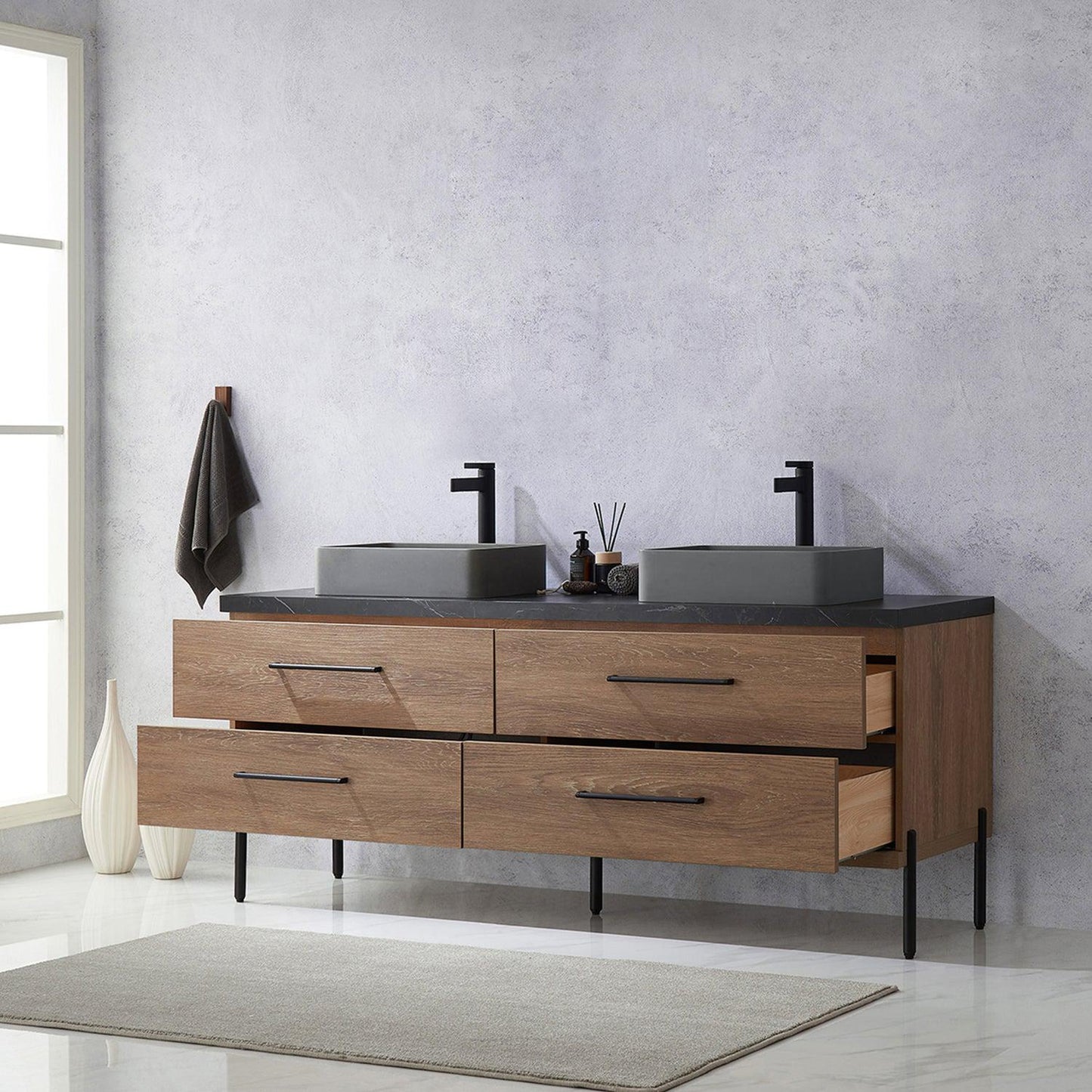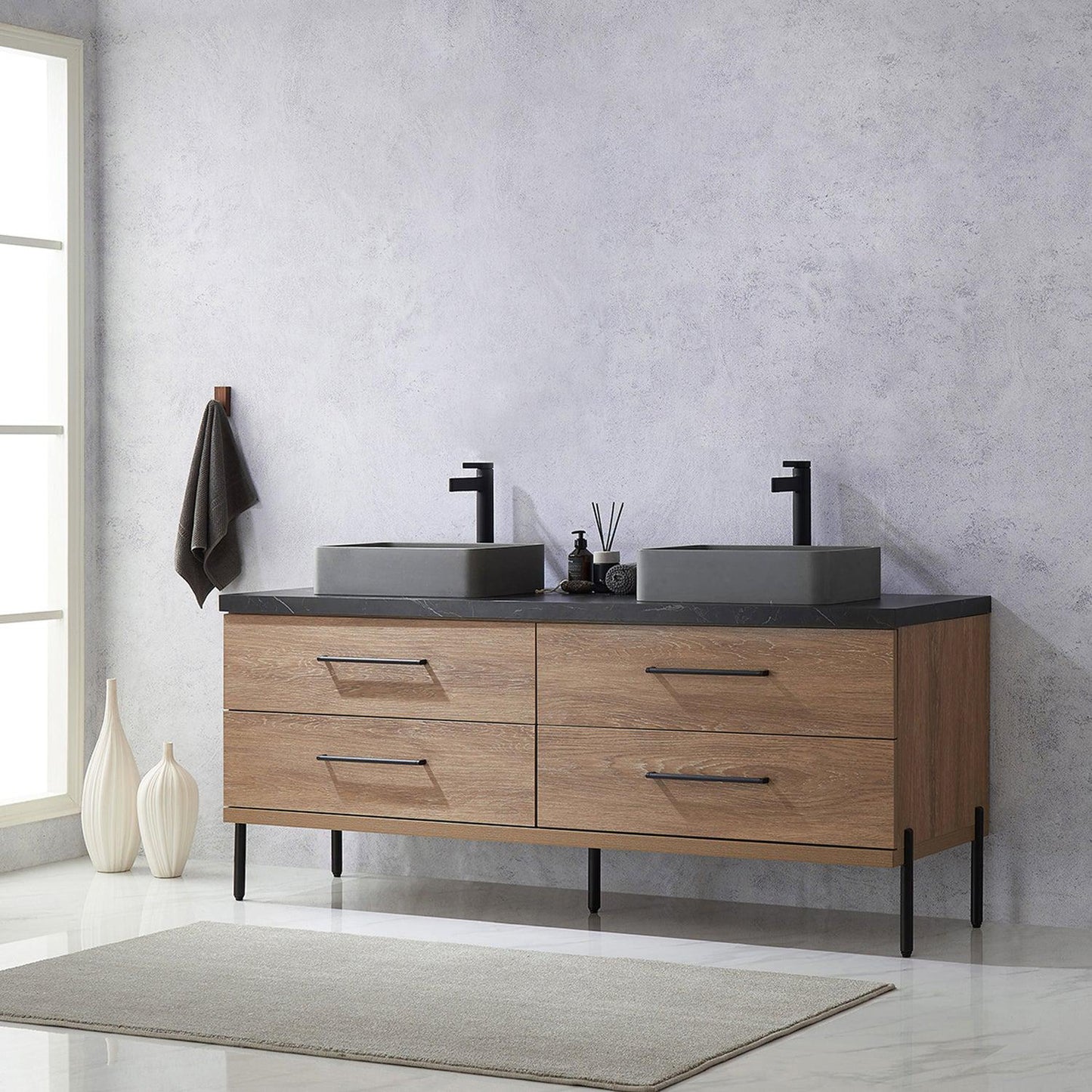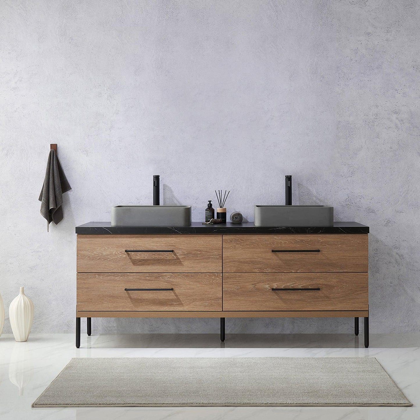 Vinnova Trento 72" Double Sink Bath Vanity In North American Oak With Black Sintered Stone Top With Rectangular Concrete Sink