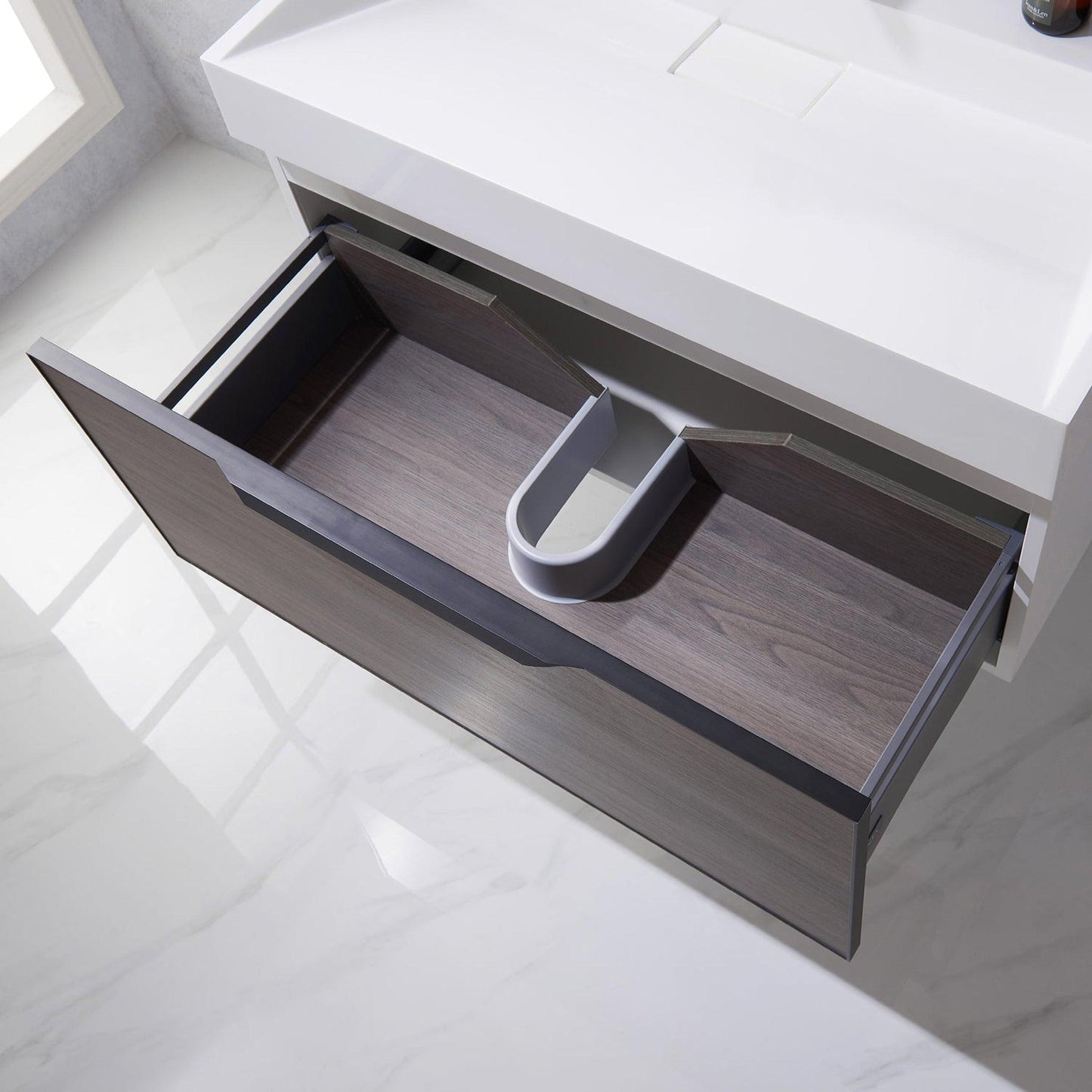 Looking for a vanity that infuses your guest or master bath with gorgeous contemporary style? The Vegadeo Bathroom Vanity features an integrated countertop and sink, with a smartly beveled basin that reduces water splashes. This unique floating ensemble anchors directly to the wall, creating a clean silhouette that enhances your minimalist décor. Spacious drawers offer generous room for storing essentials.