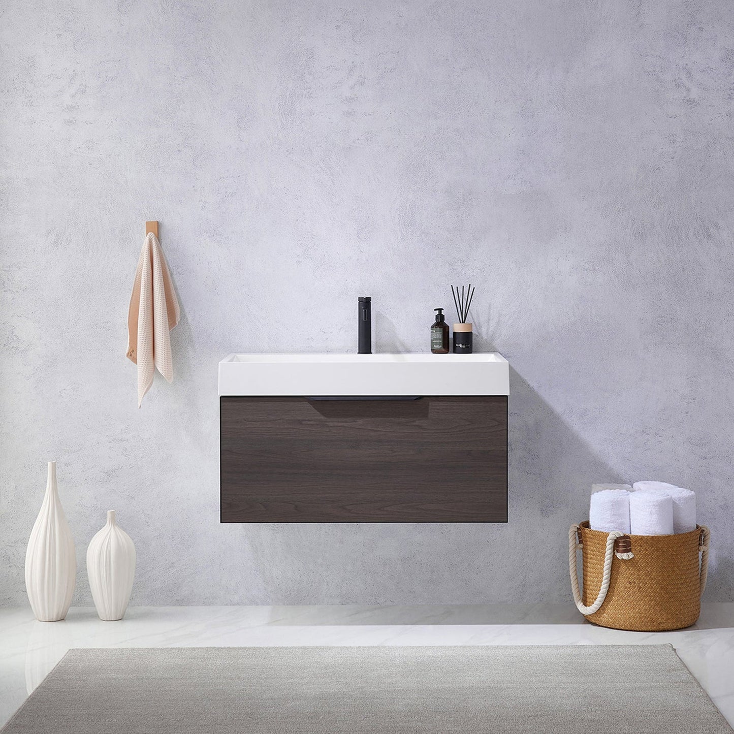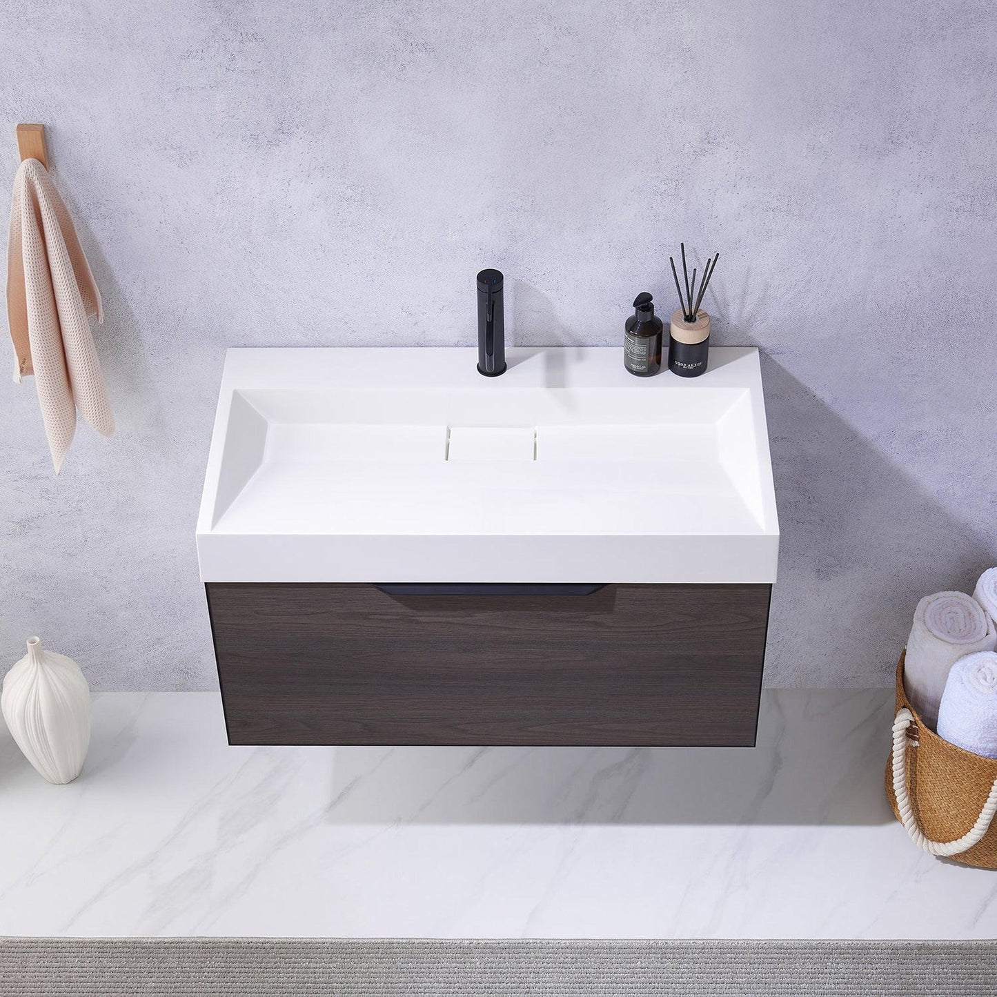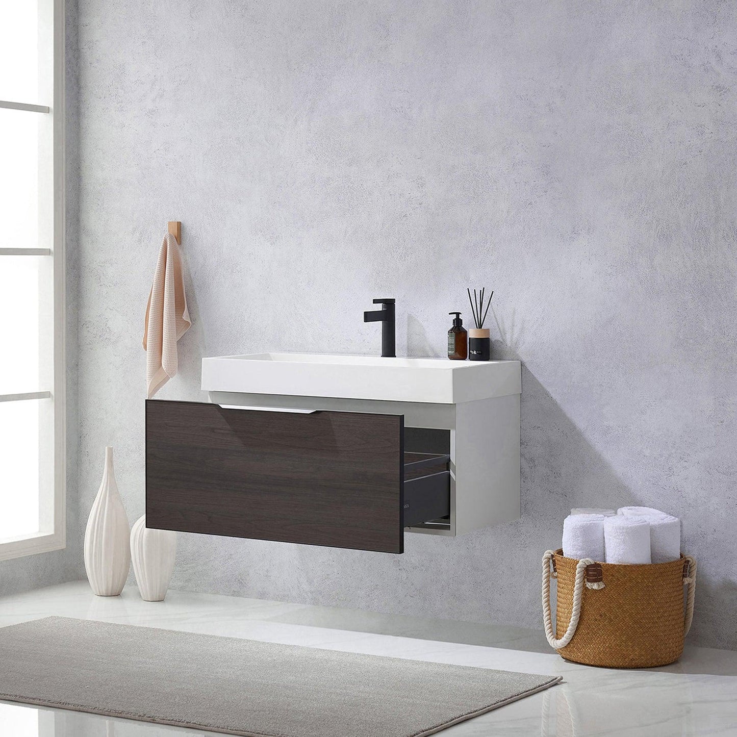 Vinnova Vegadeo 36" Single Sink Bath Vanity In Suleiman Oak Finish With White One-Piece Composite Stone Sink Top