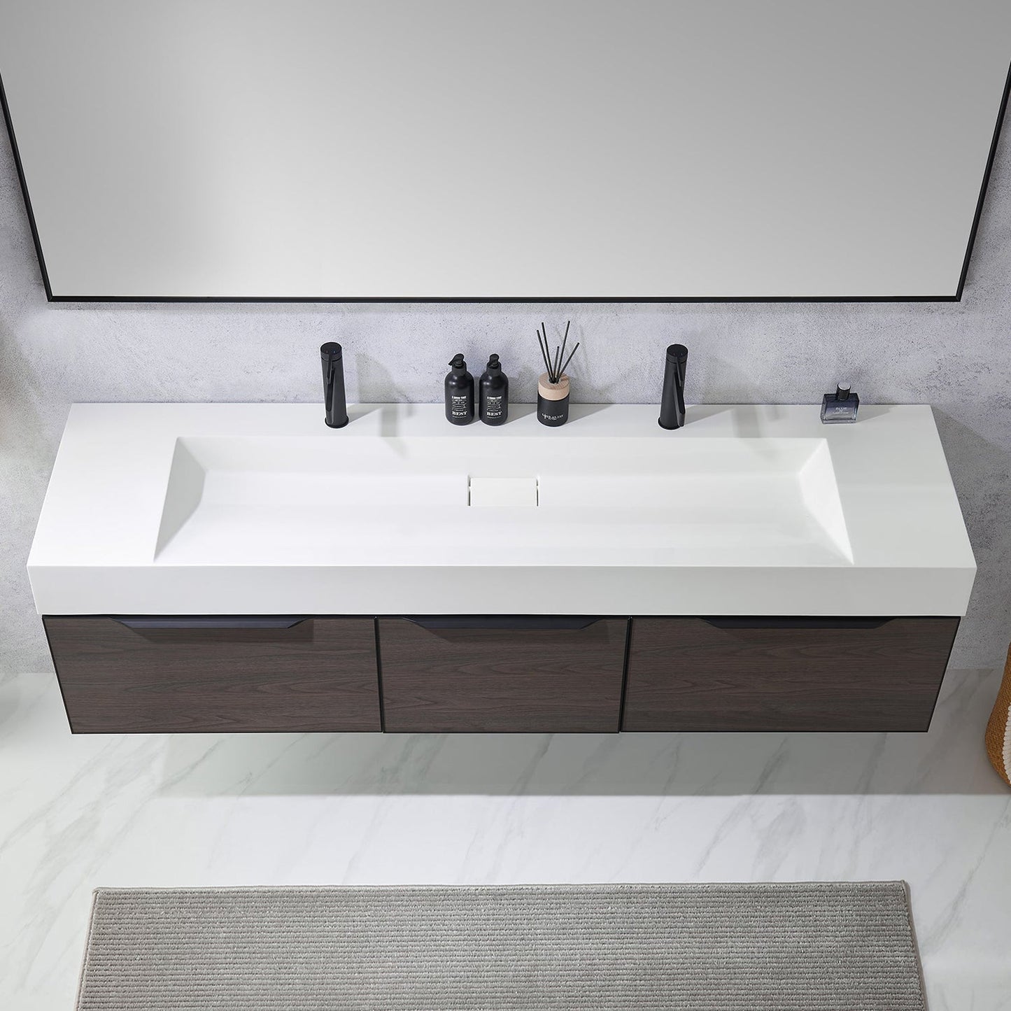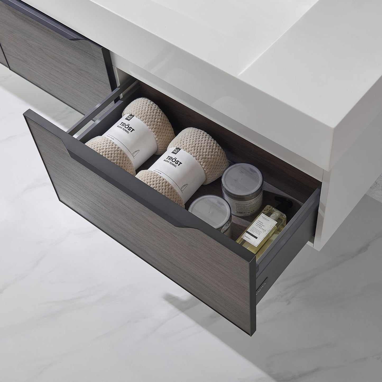 Looking for a vanity that infuses your guest or master bath with gorgeous contemporary style? The Vegadeo Bathroom Vanity features an integrated countertop and sink, with a smartly beveled basin that reduces water splashes. This unique floating ensemble anchors directly to the wall, creating a clean silhouette that enhances your minimalist décor. Spacious drawers offer generous room for storing essentials.