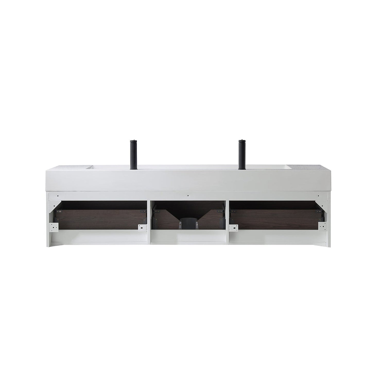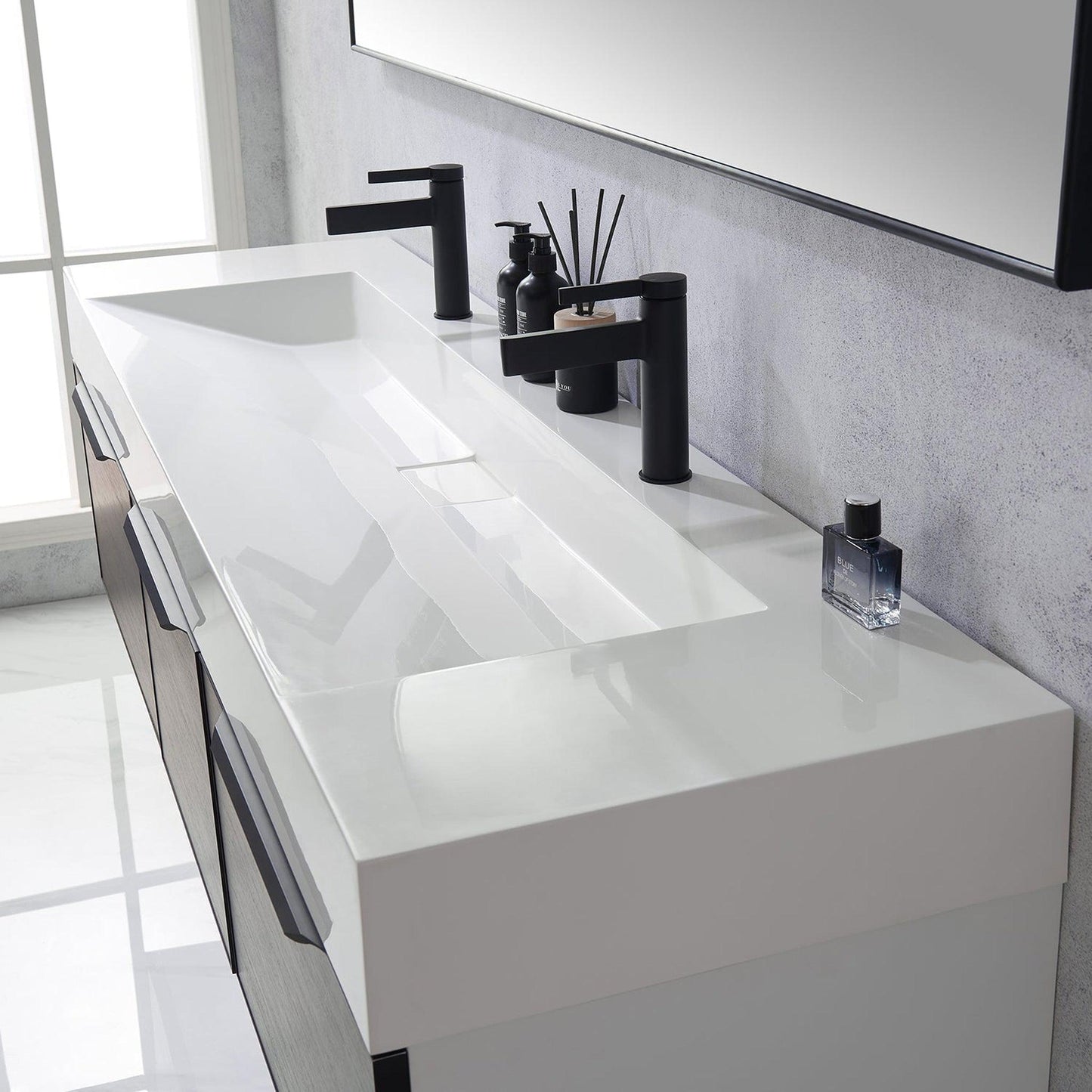 - 4.7"-thick, integrated, White composite stone sink and countertop provide a seamless, ultra-contemporary look.
