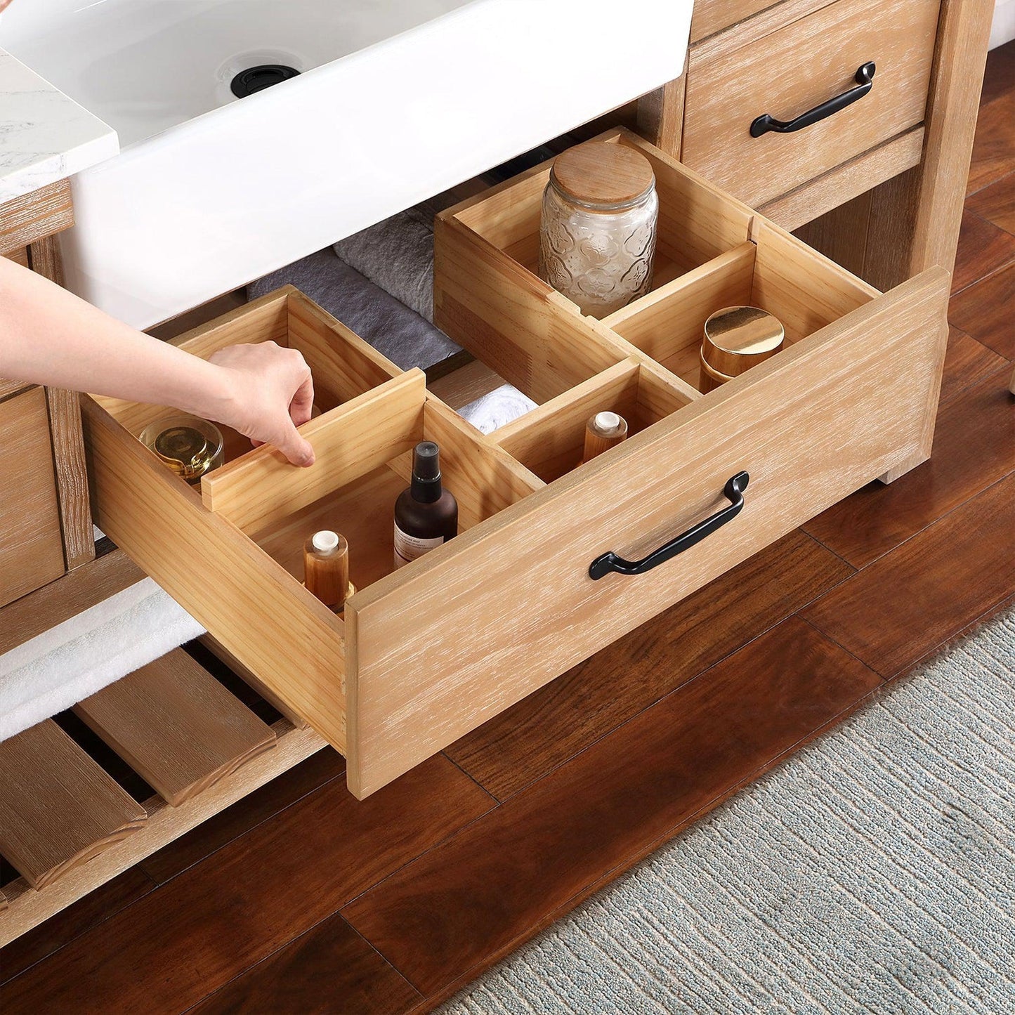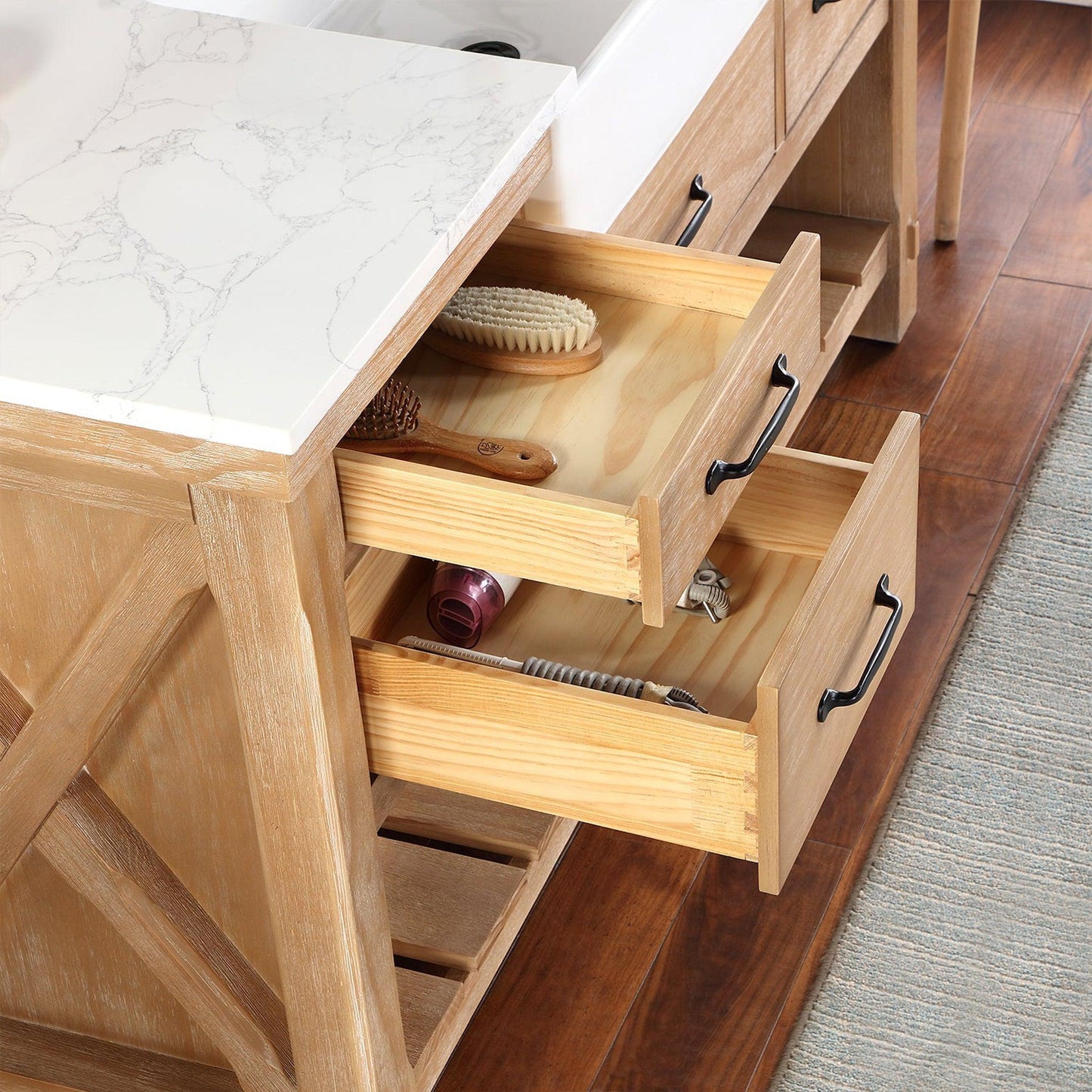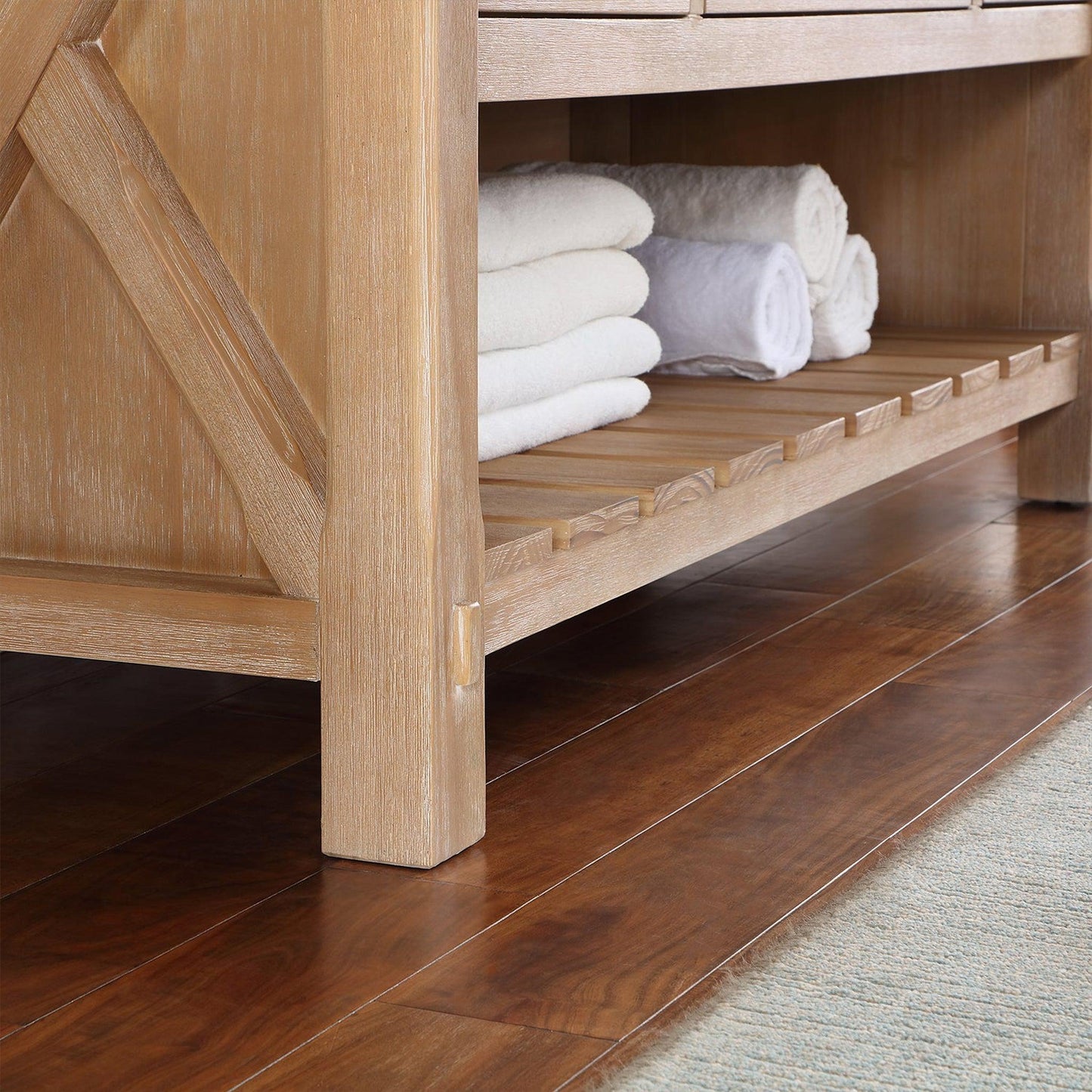 Crafted from richly grained solid hardwood, our Villareal Vanity Series blends traditional farmhouse design elements with the cool, contemporary look of natural stone. You’ll love the rustic details woven throughout this piece, from the barn door-inspired cabinet sides to the wooden slats on the lower open shelving. With its gorgeous medley of textures and tones, the Villareal will be the showpiece of your guest or master bath.