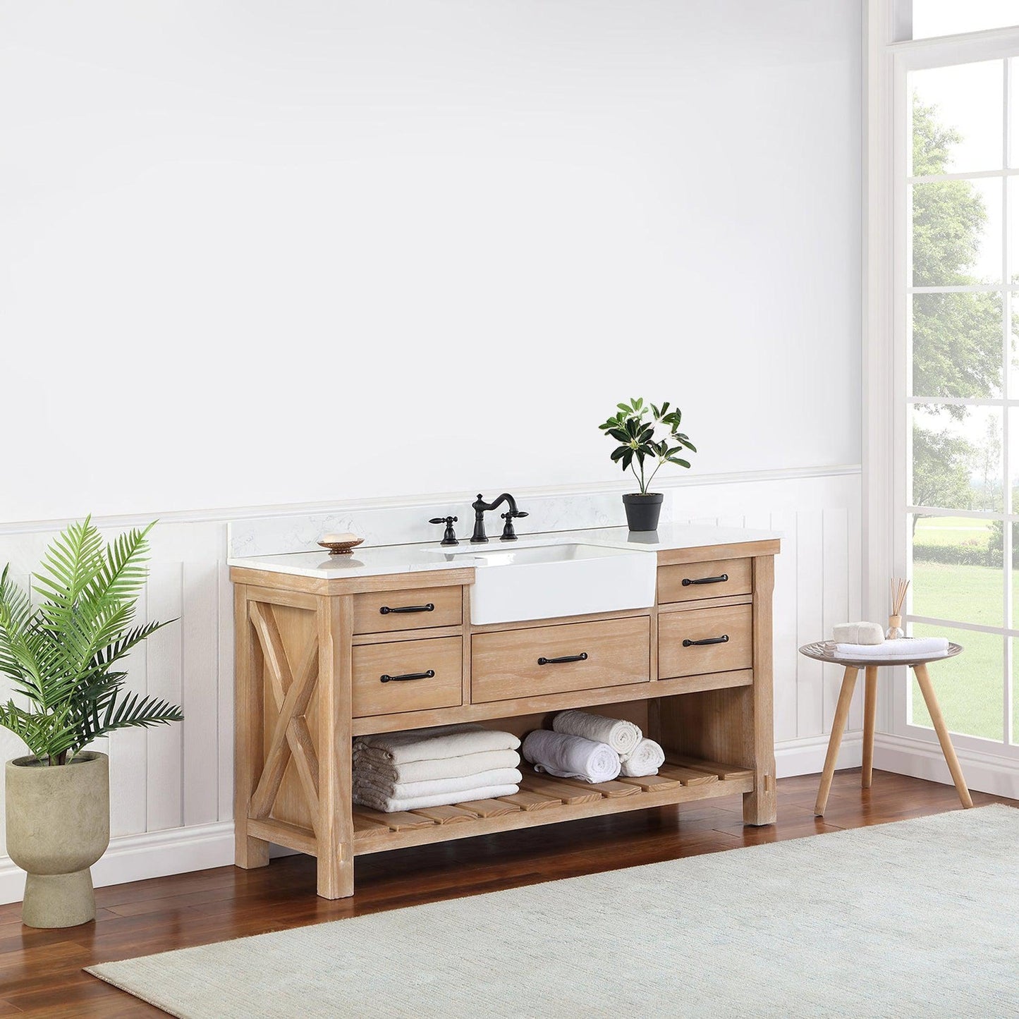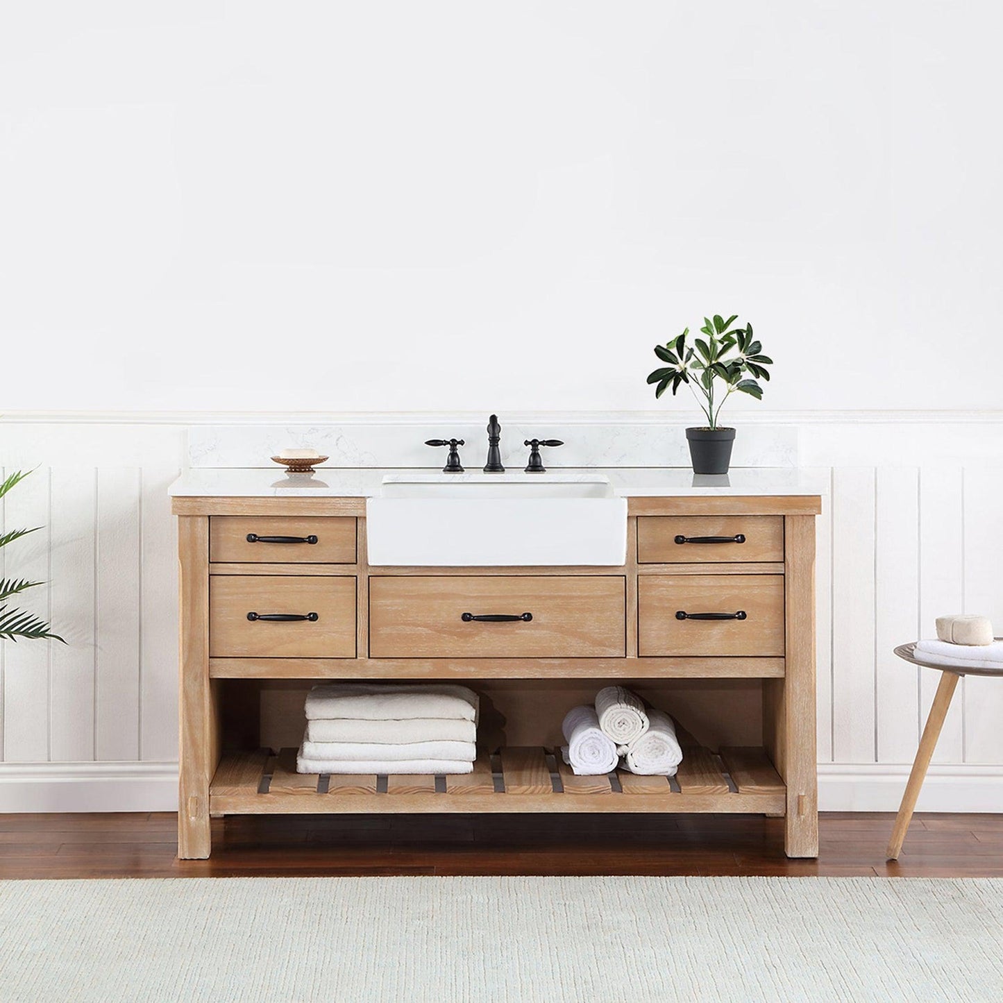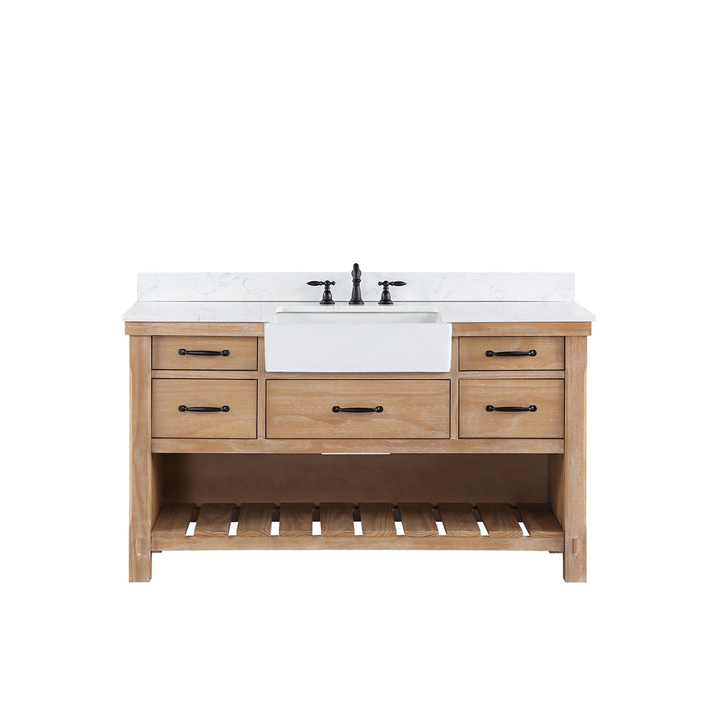 Vinnova Villareal 60" Single Bath Vanity In Weathered Pine With Composite Stone Top In White Finish And White Farmhouse Basin