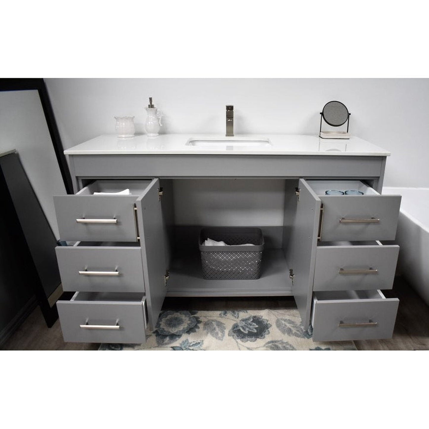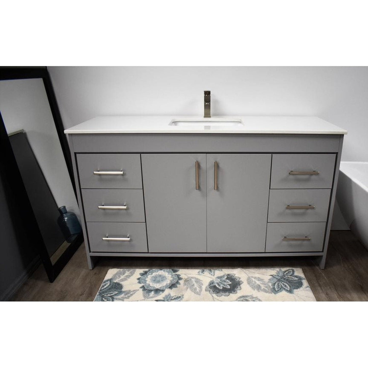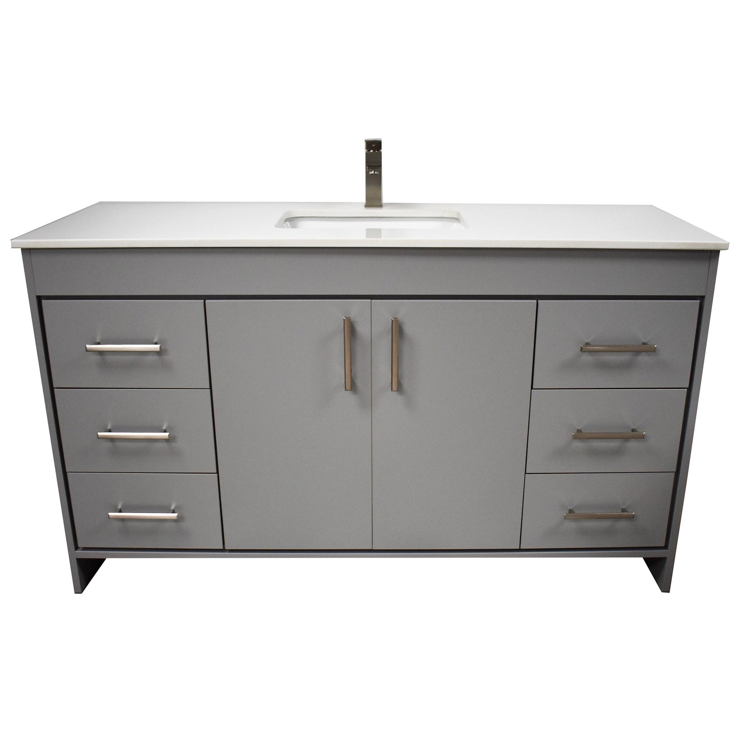 Volpa USA Capri 60" x 22" Gray Freestanding Modern Bathroom Vanity With Undermount Single Sink And White Microstone Top With Brushed Nickel Edge Handles