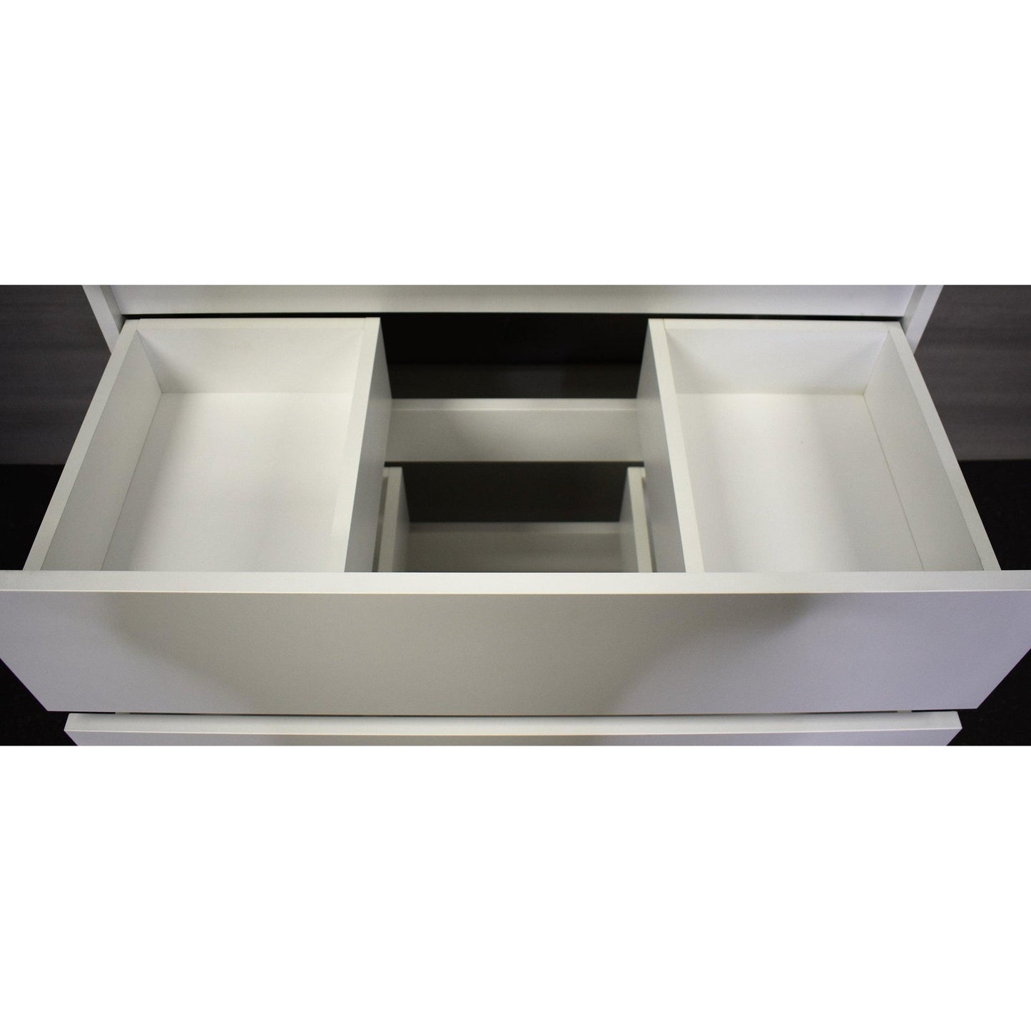Top drawer features two separate usable compartments with dimensions: 9.5 inches W x 13 inches D x 4 inches H each.