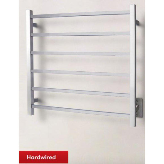 The compact and economical Tahoe 6 towel warmer from WarmlyYours provides all of the functionality of larger models while taking up significantly less wall space. This wall-mounted model comes with a discrete power switch and a hardwired electrical connection (110 – 120 VAC), which means the Tahoe 6 will present a sleek profile when installed. The 6 evenly spaced bars of this model deliver a heat output of 273 BTUs per hour, which will ensure your towels and bathrobes are warm and dry. The 304-stainless steel construction and highly polished finish make the Tahoe 6 as durable as it is elegant and functional. This model comes with built-in TempSmart™ overheat protection to prevent the unit’s surface temperature from exceeding 149°F (65°C).
