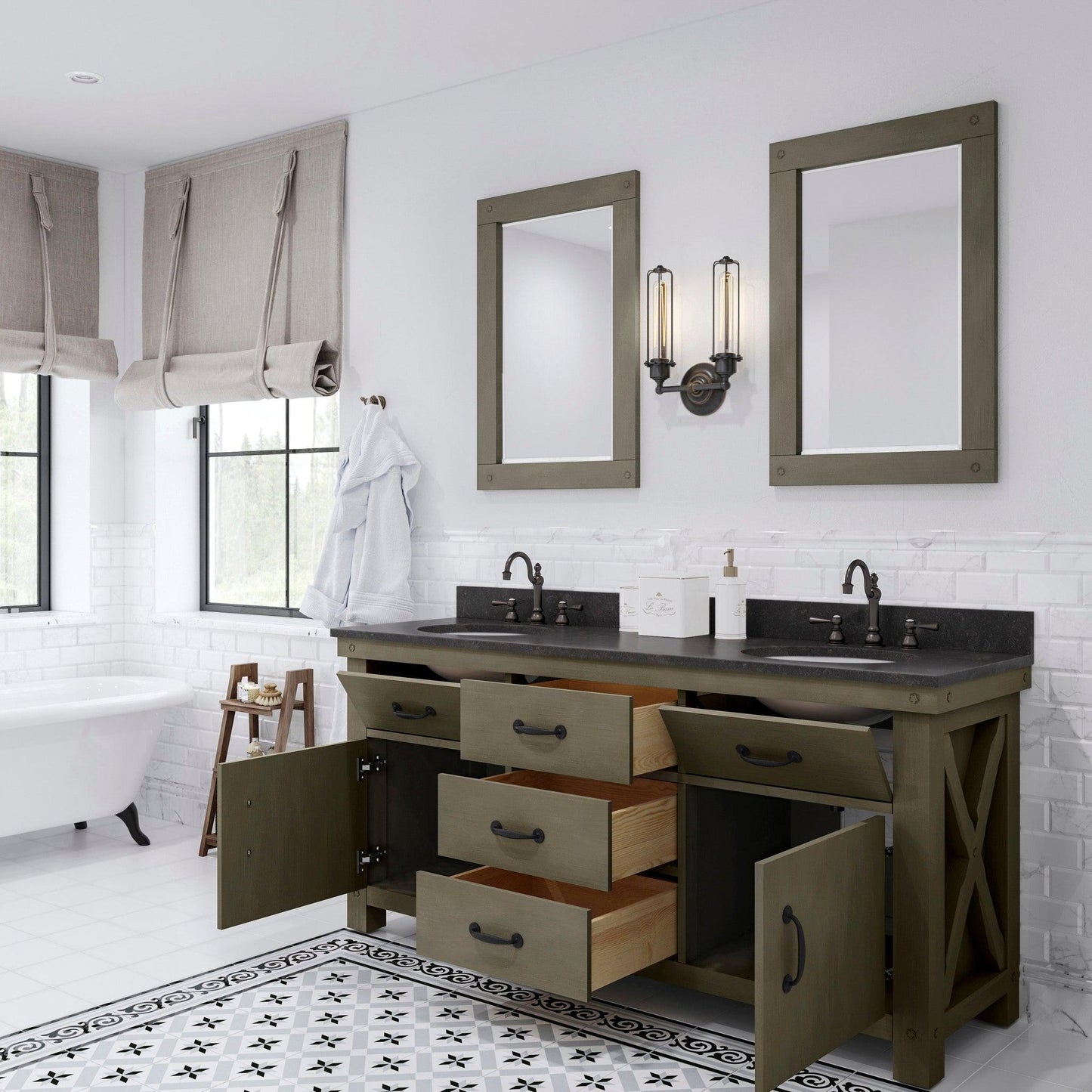 Water Creation Aberdeen 72" Grizzle Grey Double Sink Bathroom Vanity With Mirrors And Faucets With Blue Limestone Counter Top