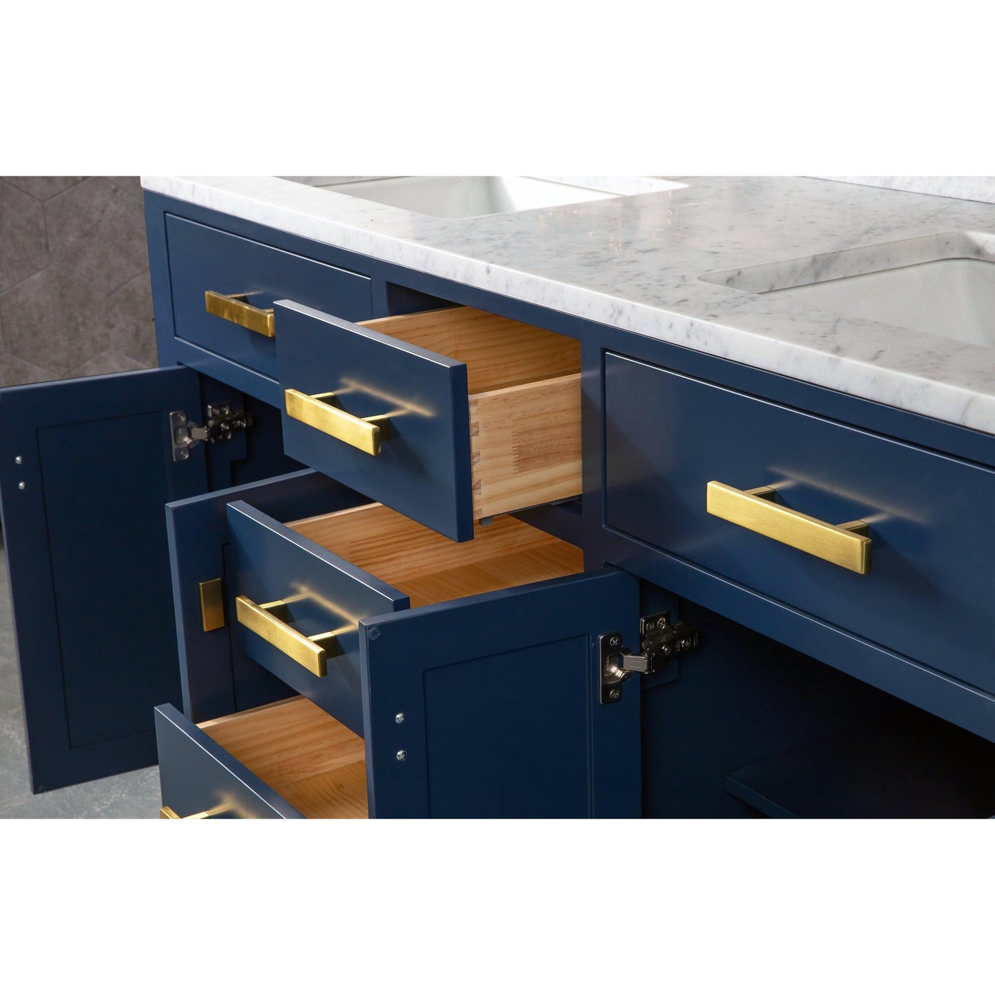 Water Creation's collection of premier double sink bathroom Vanity will add a level of sophistication and class to any bathroom's decor The crossroads of timeless design and innovative modern manufacturing processes merge harmoniously to ensure each vanity's finishes and function are as reliable as their unmistakable beauty. Constructed of 100% hardwood and not particle board, Water Creation prides itself on creating high-class Vanity that are designed to last a lifetime. The marble countertop, ceramic sinks, and elegantly crafted doors and drawers all lend credence to the durability and superior craftsmanship that Water Creation is known for. With the understanding that no one space is alike, all of Water Creation's vanity designs come in multiple lengths to accommodate any room size.Material: All of Water Creation's Vanity are made from select hardwoods that have been kiln dried to ensure a stable product that will not expand, contract, or warp.Construction: Using joinery techniques that are made to hold together for a lifetime, all Vanity come fully assembled and include interior shelving and a large cut out in the back for plumbing access.Countertop: All of Water Creation's Vanity come with solid natural stone countertops that have been sealed at the factory to prevent staining and watermarks. Countertops are pre-drilled for a standard 8" widespread 3 hole lavatory faucet. The backsplash is included. It is optional to attach the backsplash onto the vanity top.Sinks: Two undermount rectangular shaped ceramic sinks included.Finish: The multi-step finish process on the Vanity is not only rich with color and pleasing to the eye, it is also a very durable; acting as an outer shell to help protect your vanity from wear and damage that may occur in everyday use. Actual color may vary slightly due to different computer monitor display settings.