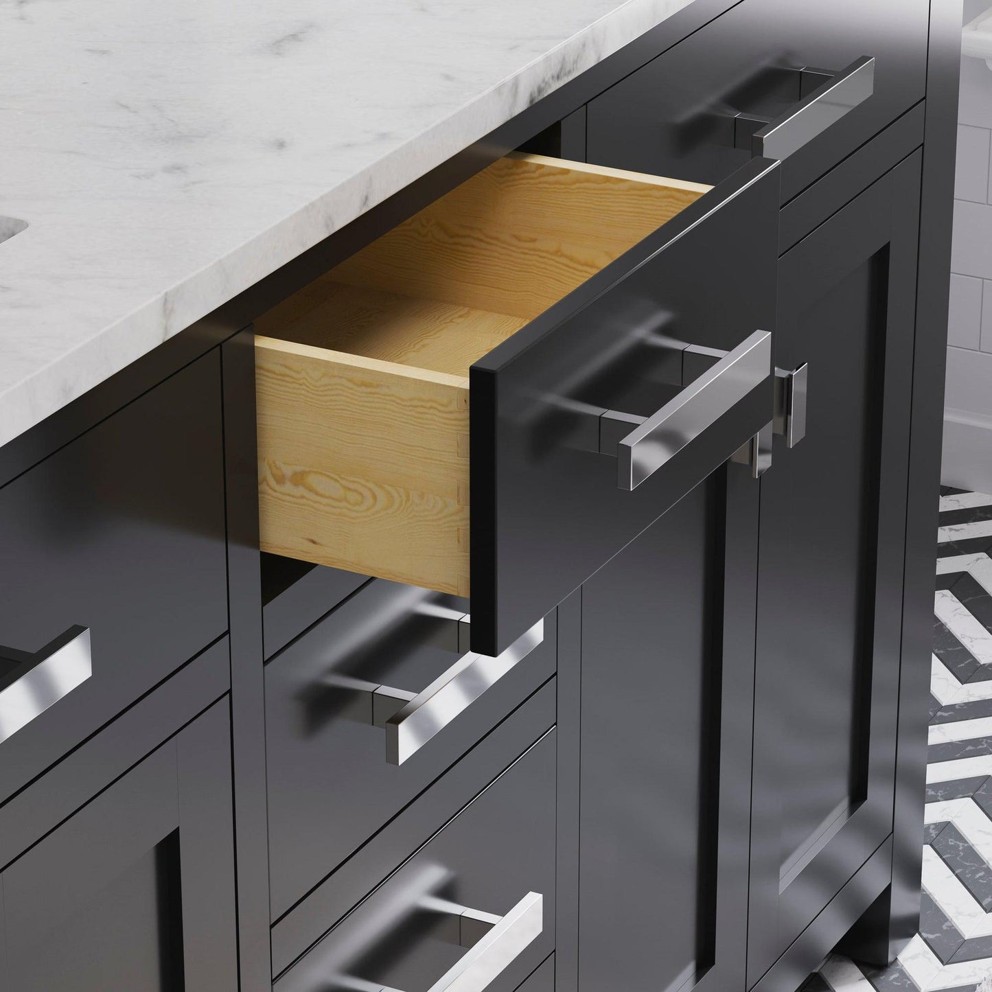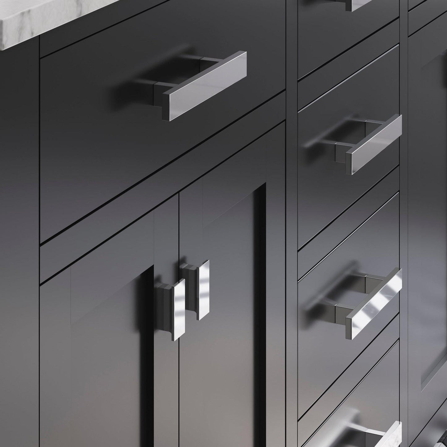 Water Creation's collection of premier double sink bathroom Vanity will add a level of sophistication and class to any bathroom's decor The crossroads of timeless design and innovative modern manufacturing processes merge harmoniously to ensure each vanity's finishes and function are as reliable as their unmistakable beauty. Constructed of 100% hardwood and not particle board, Water Creation prides itself on creating high-class Vanity that are designed to last a lifetime. The marble countertop, ceramic sinks, and elegantly crafted doors and drawers all lend credence to the durability and superior craftsmanship that Water Creation is known for. With the understanding that no one space is alike, all of Water Creation's vanity designs come in multiple lengths to accommodate any room size.Material: All of Water Creation's Vanity are made from select hardwoods that have been kiln dried to ensure a stable product that will not expand, contract, or warp.Construction: Using joinery techniques that are made to hold together for a lifetime, all Vanity come fully assembled and include interior shelving and a large cut out in the back for plumbing access.Countertop: All of Water Creation's Vanity come with solid natural stone countertops that have been sealed at the factory to prevent staining and watermarks. Countertops are pre-drilled for a standard 8" widespread 3 hole lavatory faucet. The backsplash is included. It is optional to attach the backsplash onto the vanity top.Sinks: Two undermount rectangular shaped ceramic sinks included.Finish: The multi-step finish process on the Vanity is not only rich with color and pleasing to the eye, it is also a very durable; acting as an outer shell to help protect your vanity from wear and damage that may occur in everyday use. Actual color may vary slightly due to different computer monitor display settings.