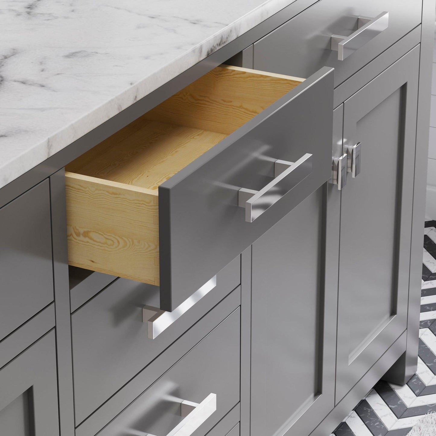 Water Creation's collection of premier double sink bathroom Vanity will add a level of sophistication and class to any bathroom's decor The crossroads of timeless design and innovative modern manufacturing processes merge harmoniously to ensure each vanity's finishes and function are as reliable as their unmistakable beauty. Constructed of 100% hardwood and not particle board, Water Creation prides itself on creating high-class Vanity that are designed to last a lifetime. The marble countertop, ceramic sinks, and elegantly crafted doors and drawers all lend credence to the durability and superior craftsmanship that Water Creation is known for. With the understanding that no one space is alike, all of Water Creation's vanity designs come in multiple lengths to accommodate any room size.Material: All of Water Creation's Vanity are made from select hardwoods that have been kiln dried to ensure a stable product that will not expand, contract, or warp.Construction: Using joinery techniques that are made to hold together for a lifetime, all Vanity come fully assembled and include interior shelving and a large cut out in the back for plumbing access.Countertop: All of Water Creation's Vanity come with solid natural stone countertops that have been sealed at the factory to prevent staining and watermarks. Countertops are pre-drilled for a standard 8" widespread 3 hole lavatory faucet. The backsplash is included. It is optional to attach the backsplash onto the vanity top.Sinks: Two undermount rectangular shaped ceramic sinks included.Finish: The multi-step finish process on the Vanity is not only rich with color and pleasing to the eye, it is also a very durable; acting as an outer shell to help protect your vanity from wear and damage that may occur in everyday use. Actual color may vary slightly due to different computer monitor display settings.