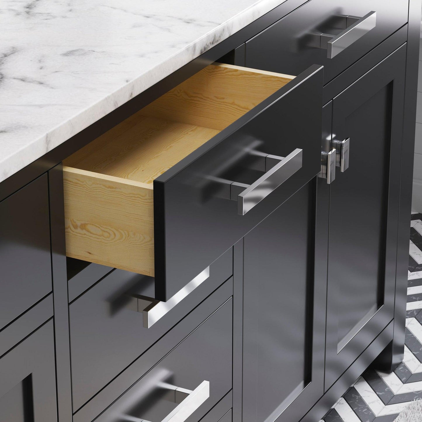 Water Creation's collection of premier double sink bathroom Vanity will add a level of sophistication and class to any bathroom's decor The crossroads of timeless design and innovative modern manufacturing processes merge harmoniously to ensure each vanity's finishes and function are as reliable as their unmistakable beauty. Constructed of 100% hardwood and not particle board, Water Creation prides itself on creating high-class Vanity that are designed to last a lifetime. The marble countertop, ceramic sinks, and elegantly crafted doors and drawers all lend credence to the durability and superior craftsmanship that Water Creation is known for. With the understanding that no one space is alike, all of Water Creation's vanity designs come in multiple lengths to accommodate any room size.Material: All of Water Creation's Vanity are made from select hardwoods that have been kiln dried to ensure a stable product that will not expand, contract, or warp.Construction: Using joinery techniques that are made to hold together for a lifetime, all Vanity come fully assembled and include interior shelving and a large cut out in the back for plumbing access.Countertop: All of Water Creation's Vanity come with solid natural stone countertops that have been sealed at the factory to prevent staining and watermarks. Countertops are pre-drilled for a standard 8" widespread 3 hole lavatory faucet. The backsplash is included. It is optional to attach the backsplash onto the vanity top.Sinks: Two undermount rectangular shaped ceramic sinks included.Finish: The multi-step finish process on the Vanity is not only rich with color and pleasing to the eye, it is also a very durable; acting as an outer shell to help protect your vanity from wear and damage that may occur in everyday use. Actual color may vary slightly due to different computer monitor display settings.