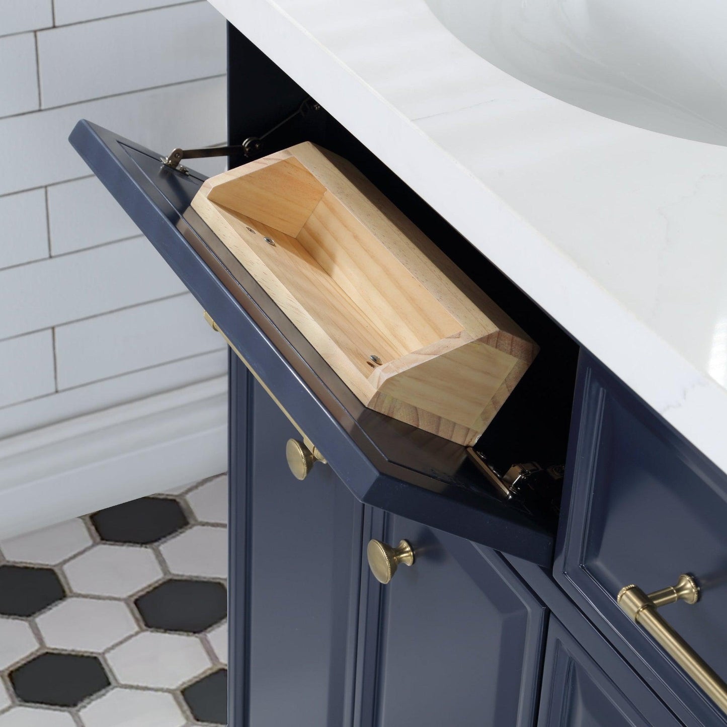 Palace collection by Water Creation, the distinctive double sink bathroom vanity set, will add a level of sophistication and classic to any bathroom styles. To come up with a great design idea for your bathroom, the vanity should be a premier element that is designed for your space, with ample storage and timeless details. With its empire palace inspired sense of style and design, this 60" Palace collection bathroom vanity with its stunning white Quartz countertop attractively goes with the flow. Distinctive flip-out front panel drawers enhance the form and function. Opposites attract and this certainly holds true when cabinet in Monarch Blue is flanked by metal hardware in beautiful Satin Gold finish. This distinguished bathroom vanity has a royal, regal character that makes you feel like the ruler of your new day.