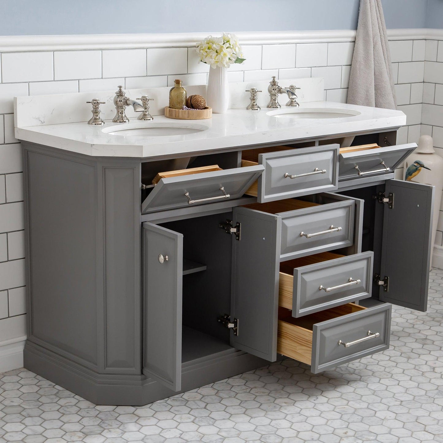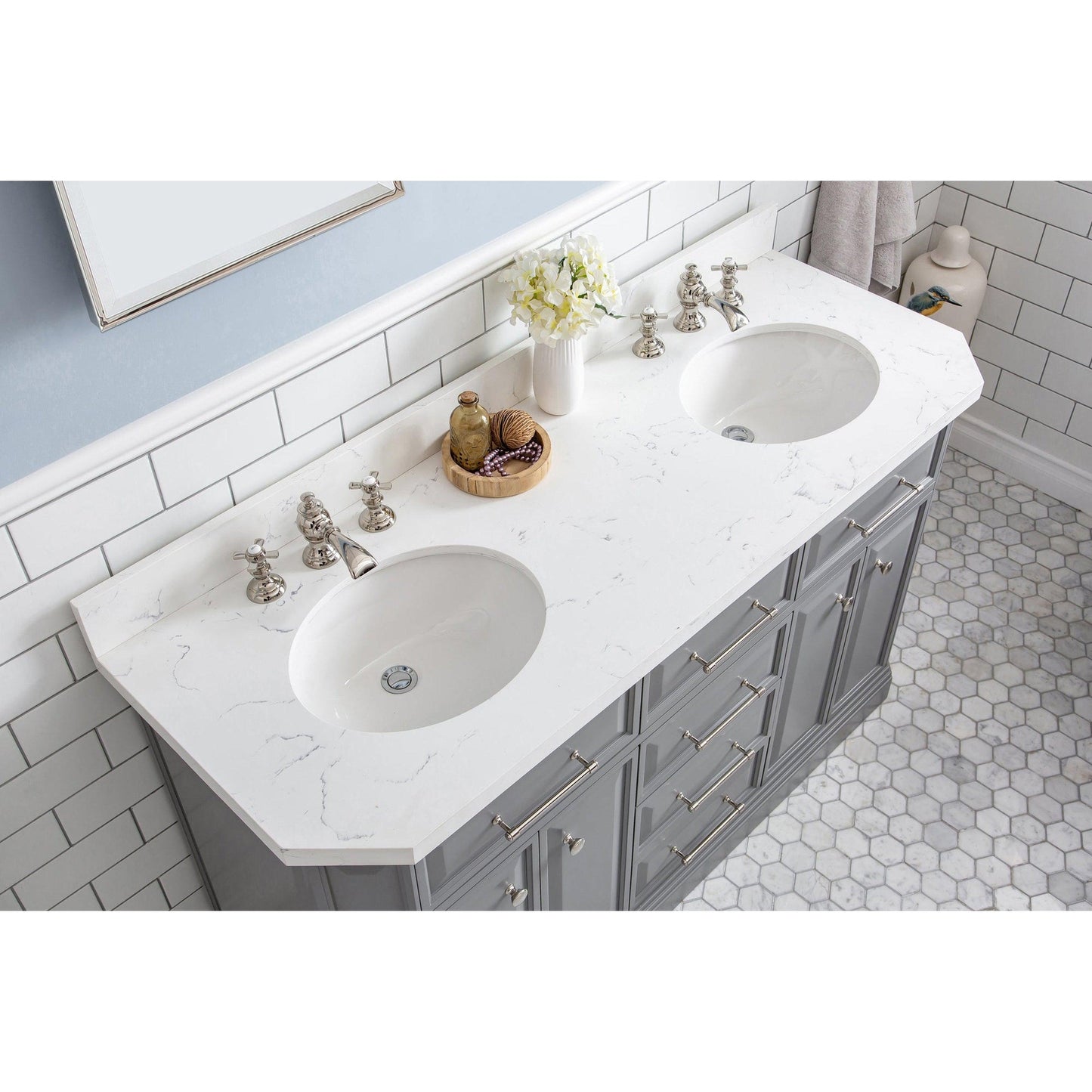 Water Creation Palace 60" Quartz Carrara Cashmere Grey Bathroom Vanity Set With Hardware And F2-0013 Faucets, Mirror in Polished Nickel (PVD) Finish