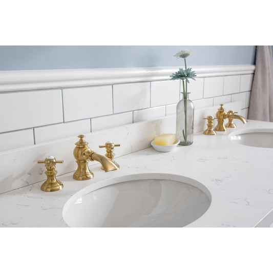 Water Creation Palace 60" Quartz Carrara Pure White Bathroom Vanity Set With Hardware And F2-0013 Faucets in Satin Gold Finish And Mirrors in Chrome Finish