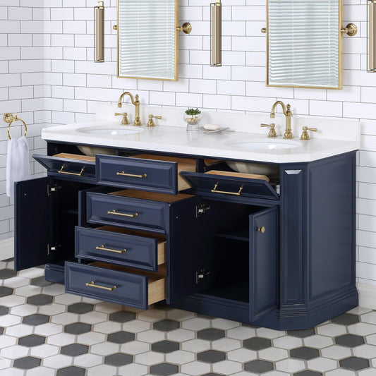 Palace collection by Water Creation, the distinctive double sink bathroom vanity set, will add a level of sophistication and classic to any bathroom styles. To come up with a great design idea for your bathroom, the vanity should be a premier element that is designed for your space, with ample storage and timeless details. With its empire palace inspired sense of style and design, this 72" Palace collection bathroom vanity with its stunning white Quartz countertop attractively goes with the flow. Distinctive flip-out front panel drawers enhance the form and function. Opposites attract and this certainly holds true when cabinet in Monarch Blue is flanked by metal hardware in beautiful Satin Gold finish. This distinguished bathroom vanity has a royal, regal character that makes you feel like the ruler of your new day.