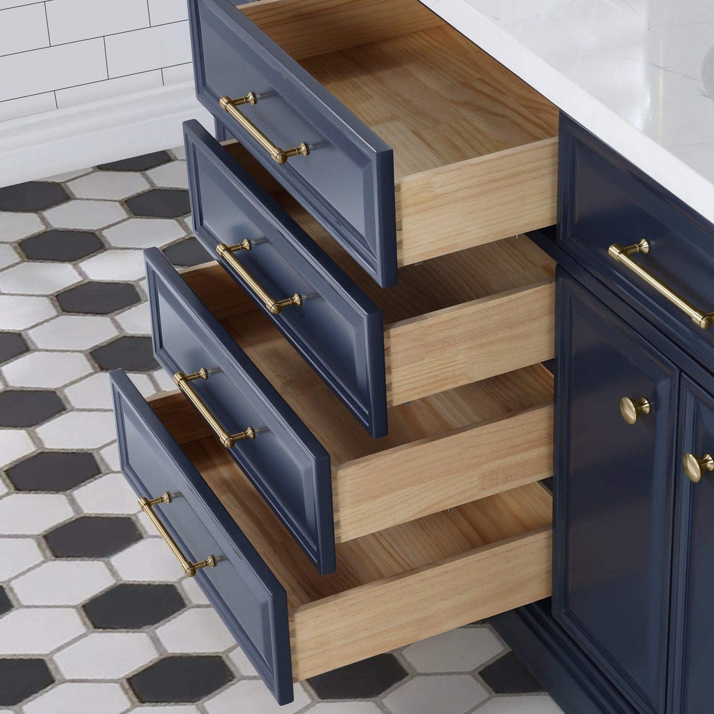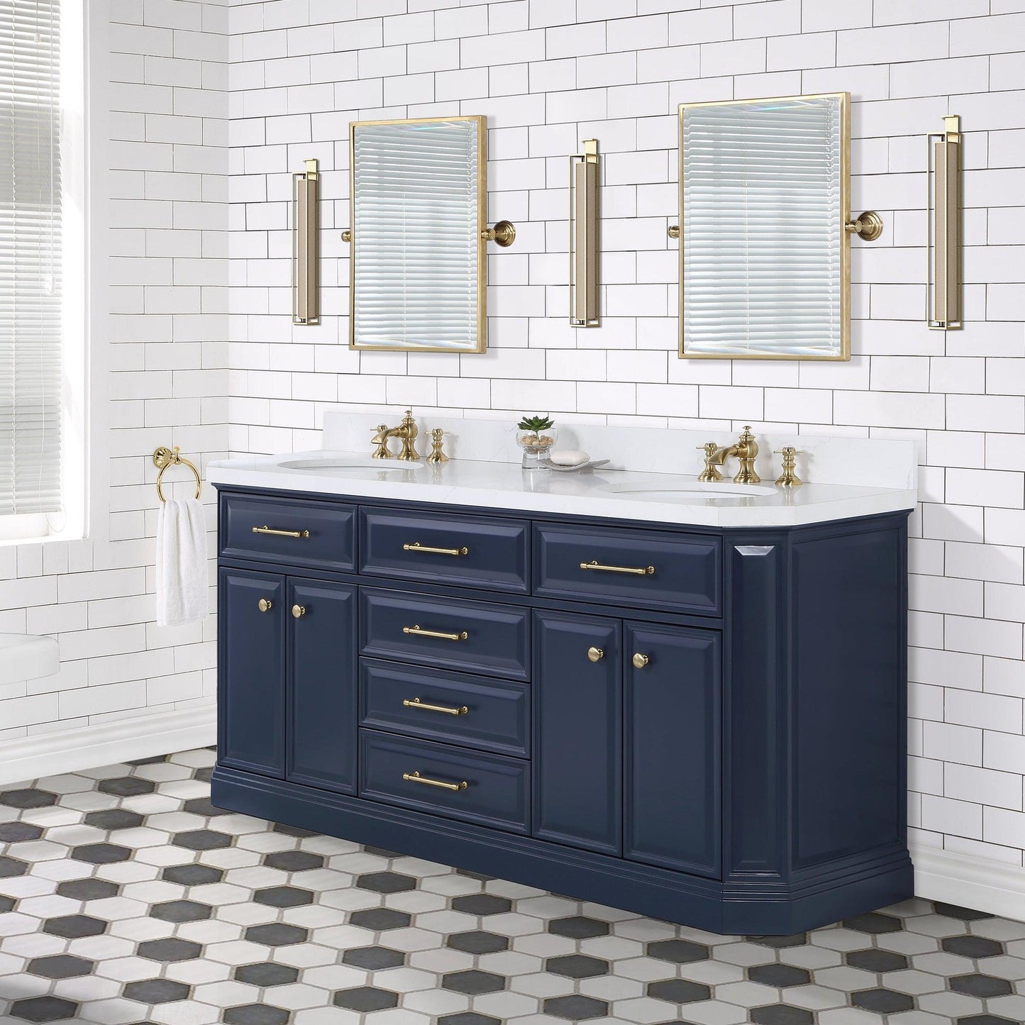 Palace collection by Water Creation, the distinctive double sink bathroom vanity set, will add a level of sophistication and classic to any bathroom styles. To come up with a great design idea for your bathroom, the vanity should be a premier element that is designed for your space, with ample storage and timeless details. With its empire palace inspired sense of style and design, this 72" Palace collection bathroom vanity with its stunning white Quartz countertop attractively goes with the flow. Distinctive flip-out front panel drawers enhance the form and function. Opposites attract and this certainly holds true when cabinet in Monarch Blue is flanked by metal hardware in beautiful Satin Gold finish. This distinguished bathroom vanity has a royal, regal character that makes you feel like the ruler of your new day.
