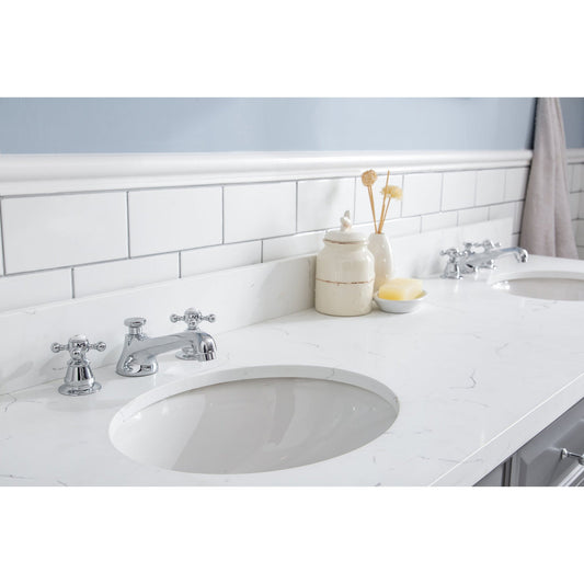 Water Creation Palace 72" Quartz Carrara Cashmere Grey Bathroom Vanity Set With Hardware And F2-0009 Faucets, Mirror in Chrome Finish