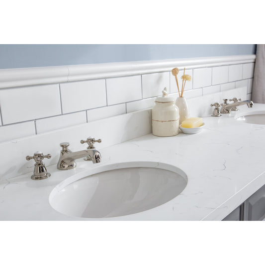 Water Creation Palace 72" Quartz Carrara Cashmere Grey Bathroom Vanity Set With Hardware And F2-0009 Faucets, Mirror in Polished Nickel (PVD) Finish