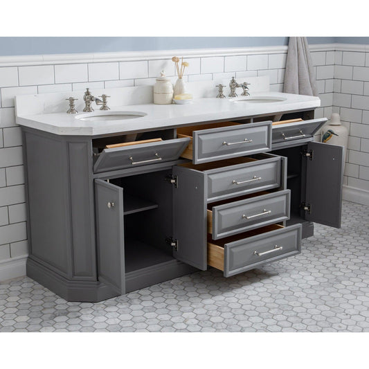 Water Creation Palace 72" Quartz Carrara Cashmere Grey Bathroom Vanity Set With Hardware, Mirror in Polished Nickel (PVD) Finish