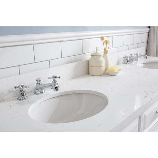Water Creation Palace 72" Quartz Carrara Pure White Bathroom Vanity Set With Hardware And F2-0009 Faucets, Mirror in Chrome Finish