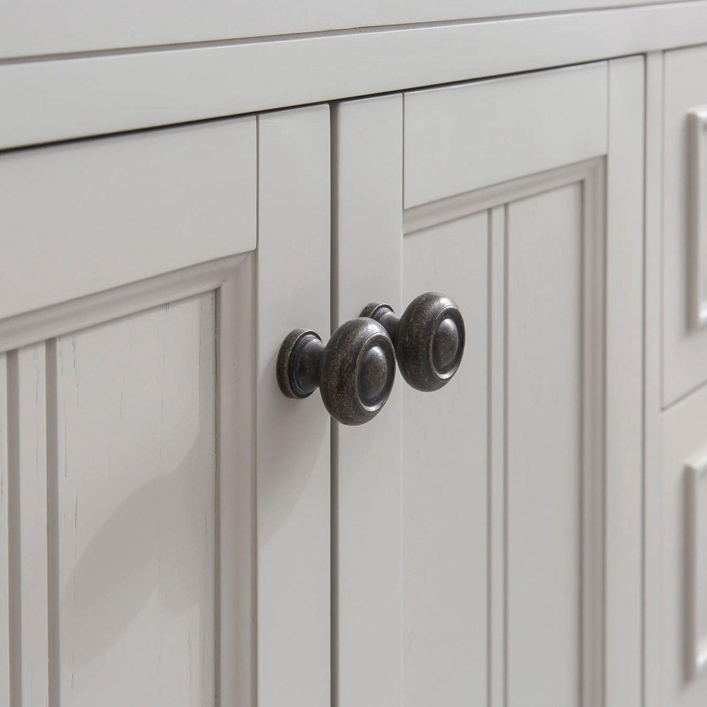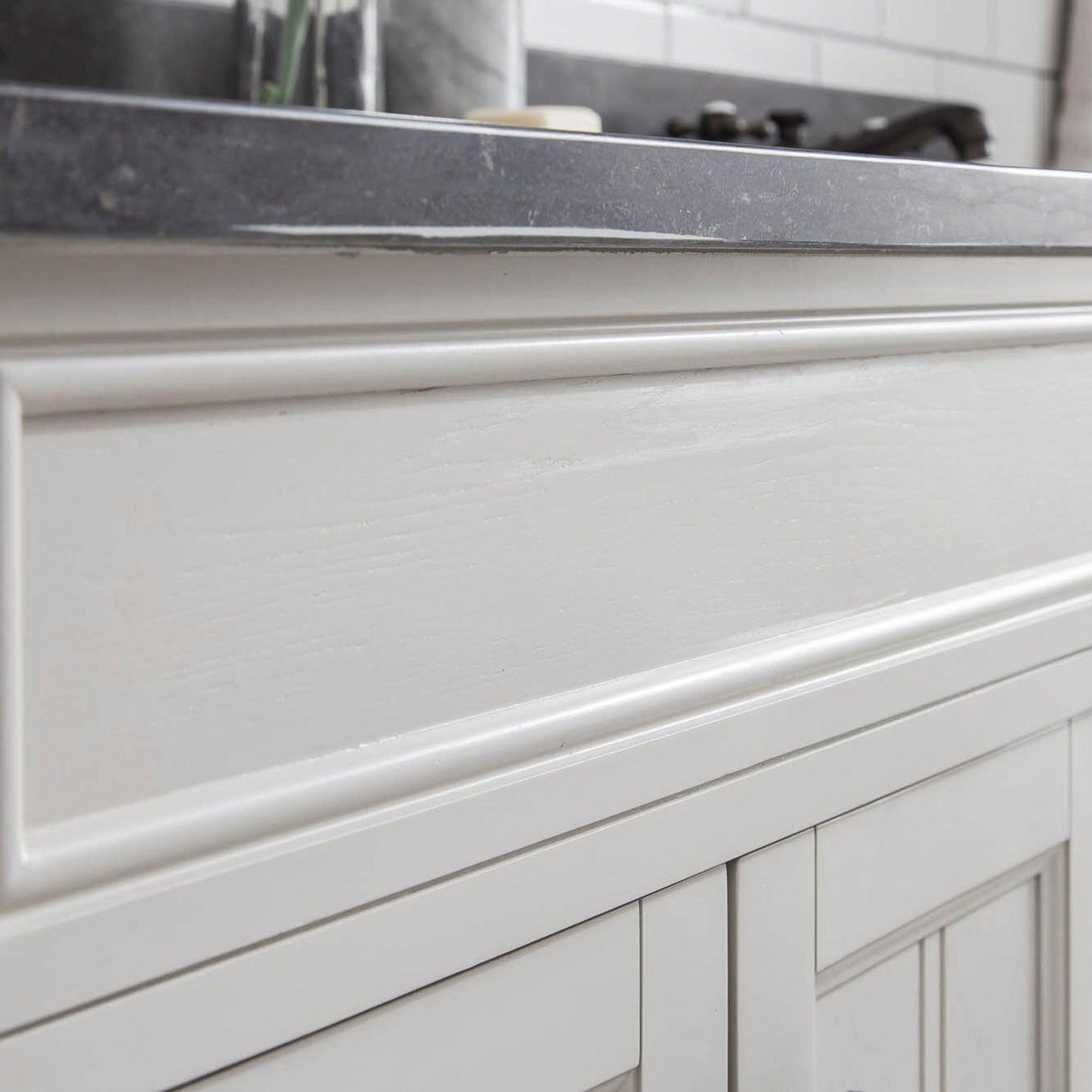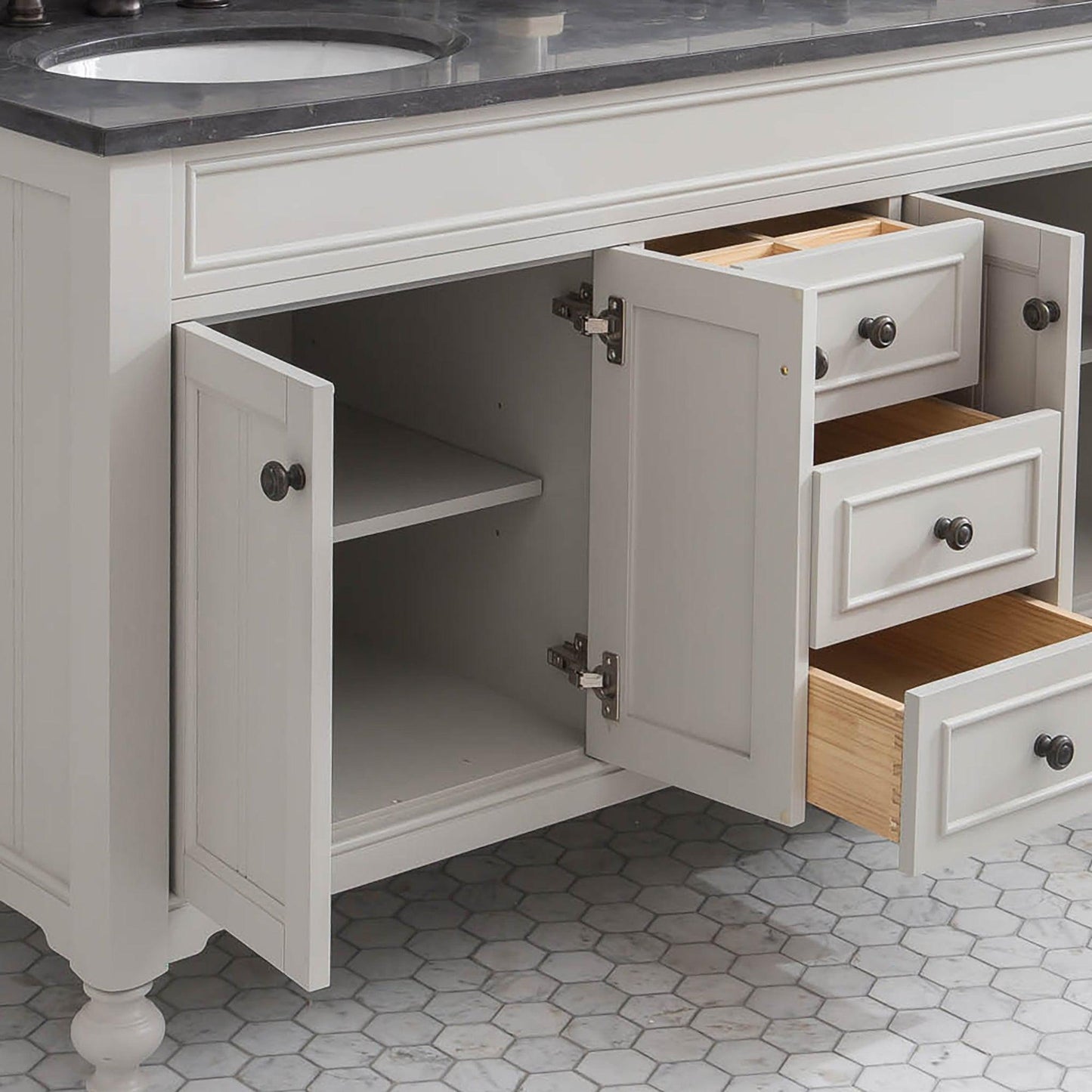 Potenza collection bathroom vanity with blue limestone top definitely turns on the upscale rustic and contemporary charm. Crafted for form and function, this 60†solid wood vanity includes a trio of soft closing drawers. With its elegant and timeless design, double-door with parallel lines element reveals ample storage for towels, toiletries and more. Richly traditional elements such as wood grain, elegant round legs and earl grey finish grant this bathroom vanity with integrated sink such division. Incorporating beveled countertop edge for vitreous ceramic sink, the craftmanship and details are impressive. Combined with this beautiful deck-mounted roman lavatory faucet (oil-bronze accent), we express an upgrade for refreshing bathroom.