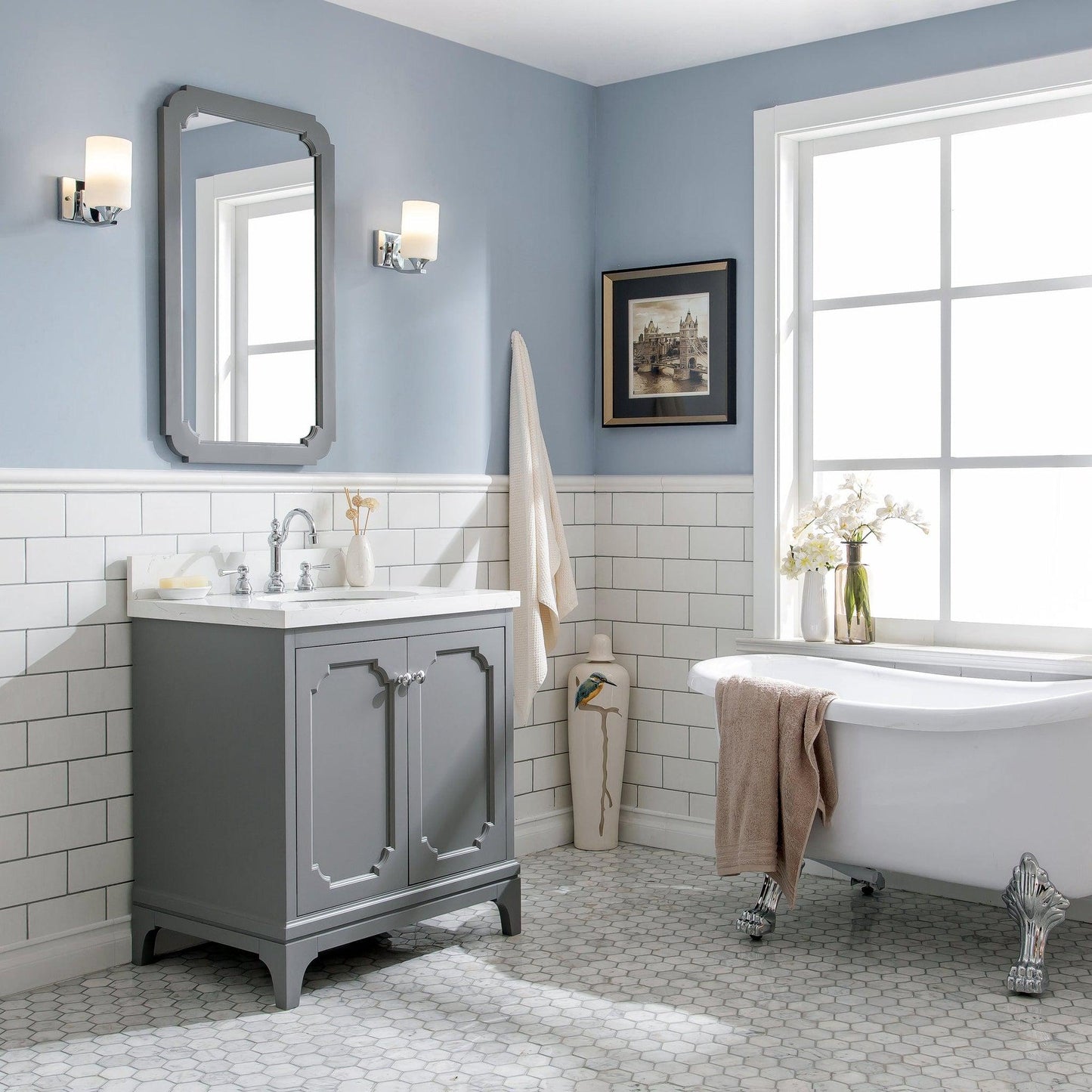 Water Creation Queen 30" Single Sink Quartz Carrara Vanity In Cashmere Grey With F2-0012-01-TL Lavatory Faucet(s)