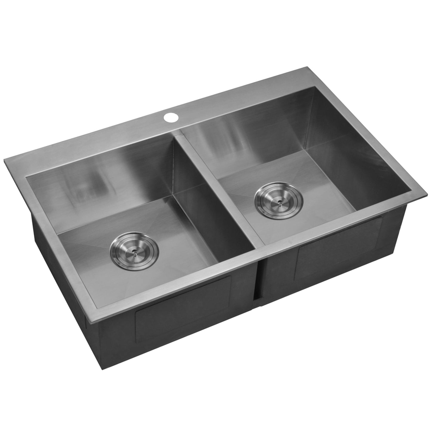 Water Creation Zero Radius 50/50 Double Bowl Stainless Steel Hand Made Drop In 33 Inch X 22 Inch Sink With Drains And Strainers
