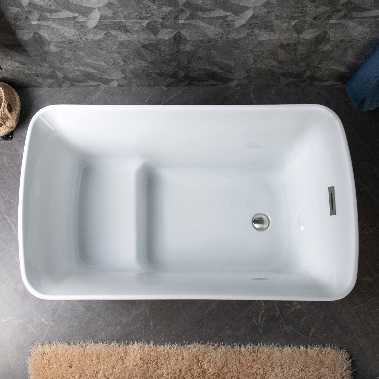 WoodBridge 48" White Acrylic Freestanding Square Contemporary Soaking Tub With Pre-molded Seat and Chrome Pop-up Drain, Overflow, F0002CHVT Tub Filler and Caddy Tray