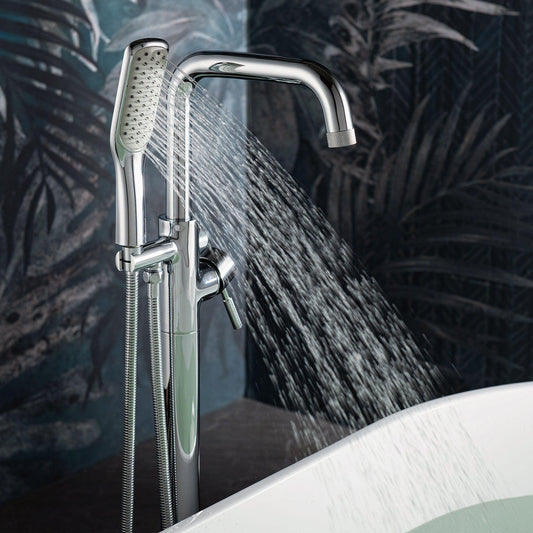 WoodBridge BTA0088 56" White Acrylic Freestanding Soaking Bathtub With Chrome Drain, Overflow, F0071CHSQ Tub Filler and Caddy Tray
