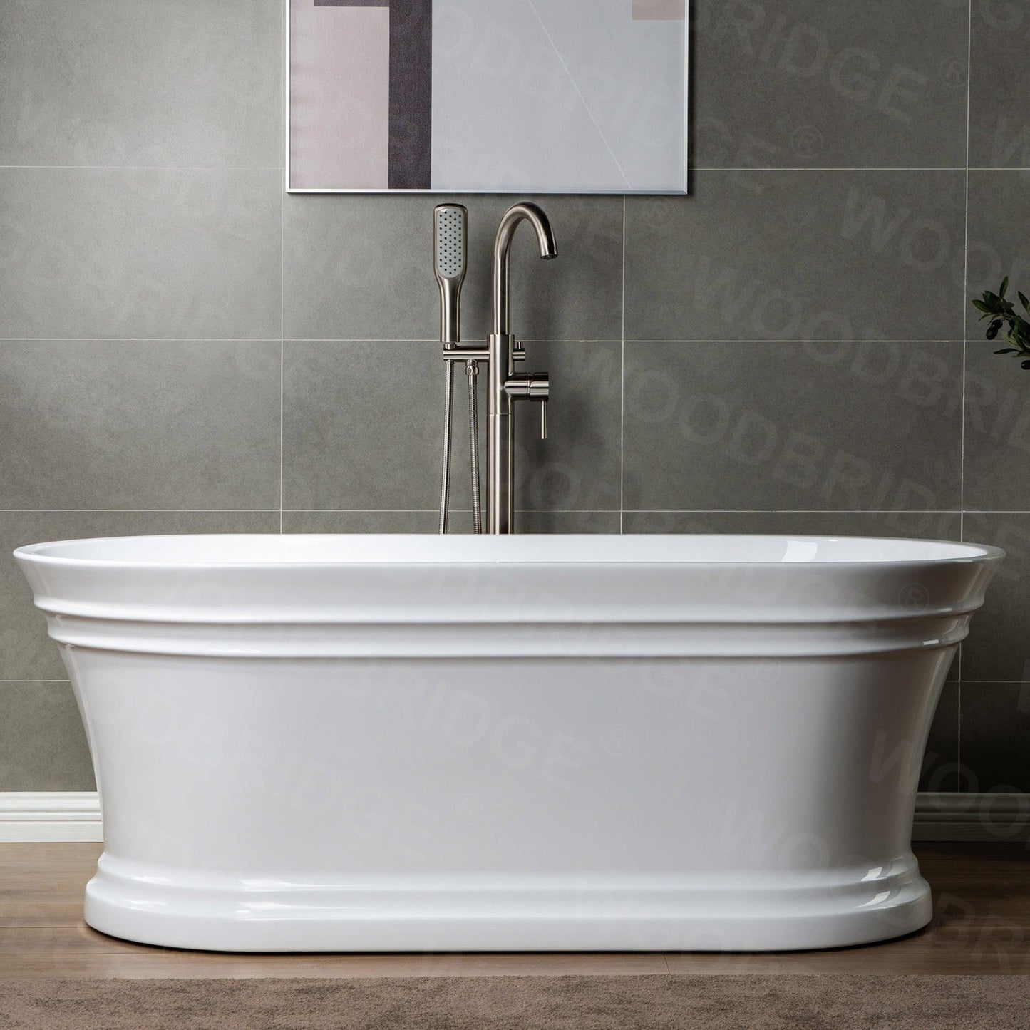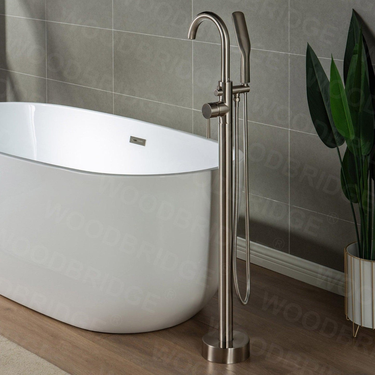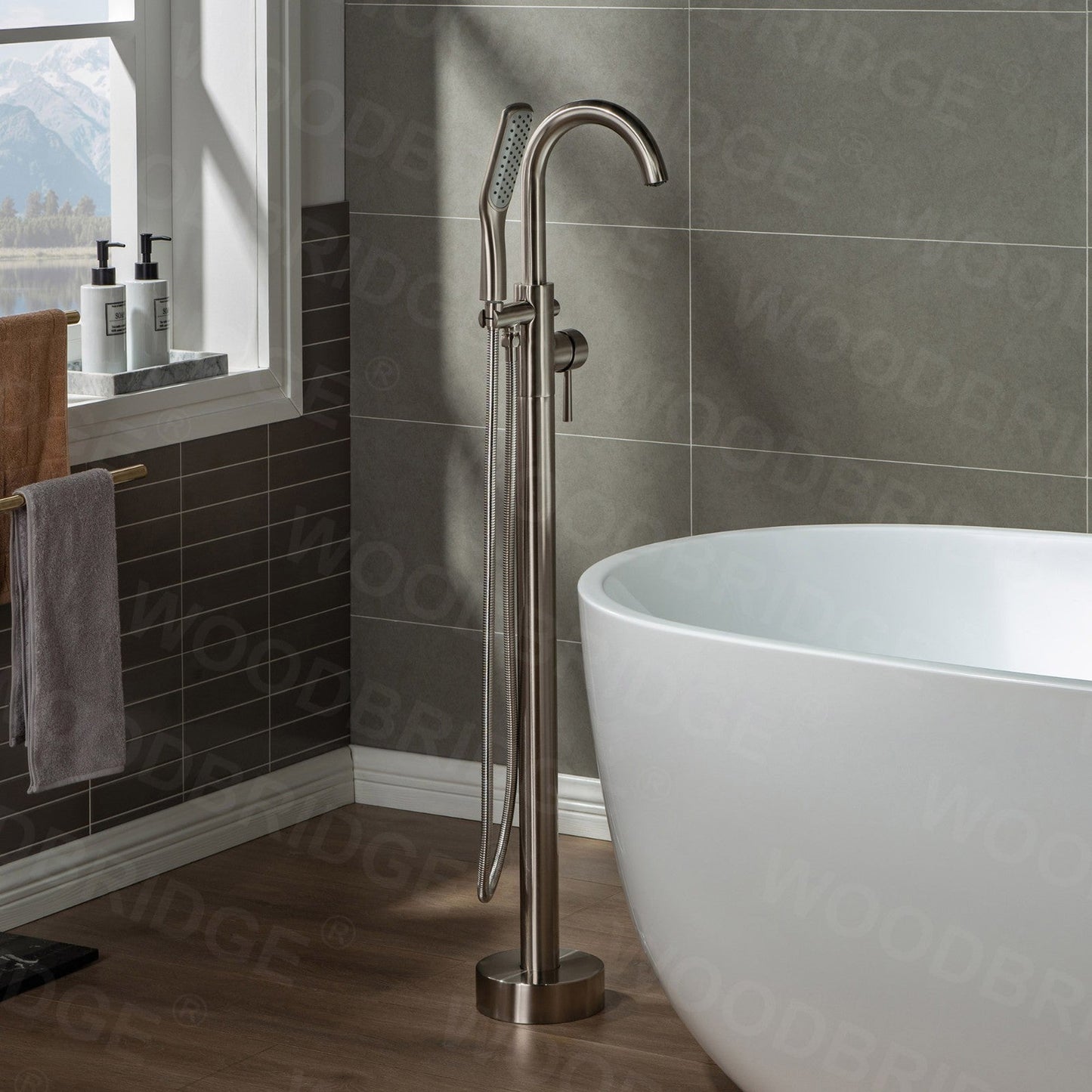 WoodBridge F0001BNSQ Brushed Nickel Contemporary Single Handle Floor Mount Freestanding Tub Filler Faucet With Square Hand Shower