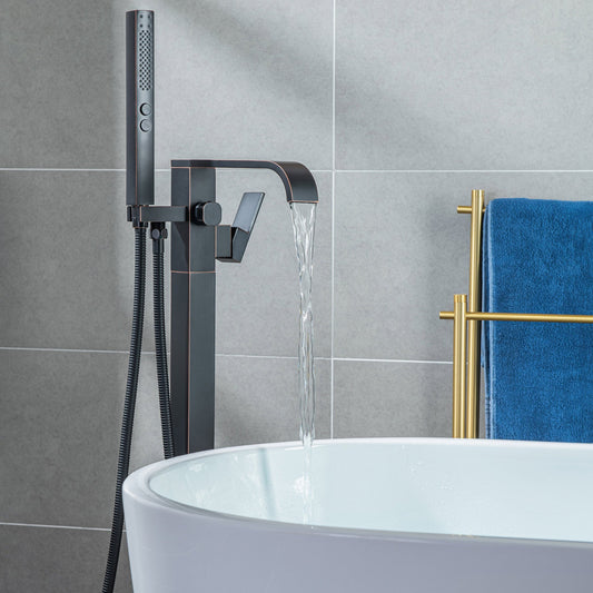 WoodBridge F0038ORB Oil Rubbed Bronze Contemporary Single Handle Floor Mount Freestanding Tub Filler Faucet With Square Hand Shower