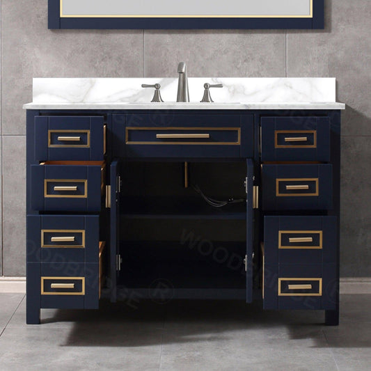 Woodbridge Milan 49" Navy Blue Solid Wood Vanity Base and White Fish Belly Engineered Stone Composite Top, Single Basin With Pre-Drilled Holes for 4" Centerset Faucet