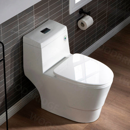 WoodBridge T0001-MB White One Piece Toilet With Soft Closing Seat, Chair Height, 1.28 GPF Dual, Water Sensed, 1000 Gram Map Flushing Score Toilet With Matte Black Button