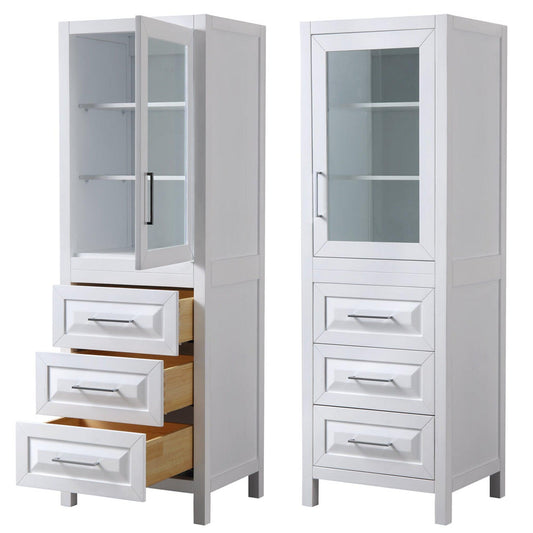 Wyndham Collection Daria Linen Tower in White With Shelved Cabinet Storage and 3 Drawers