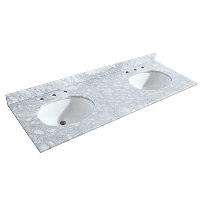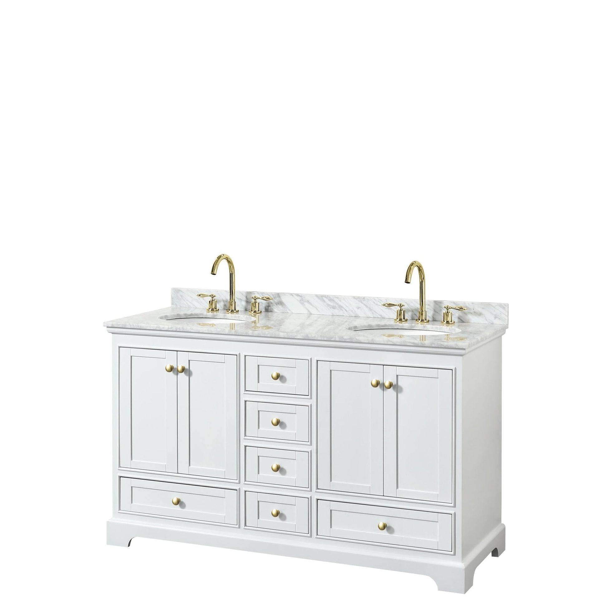 Wyndham Collection Deborah 60" Double Bathroom Vanity in White, White Carrara Marble Countertop, Undermount Oval Sinks, Brushed Gold Trim, No Mirror