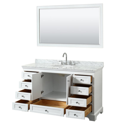 Wyndham Collection Deborah 60" Single Bathroom Vanity in White, White Carrara Marble Countertop, Undermount Oval Sink, and 58" Mirror