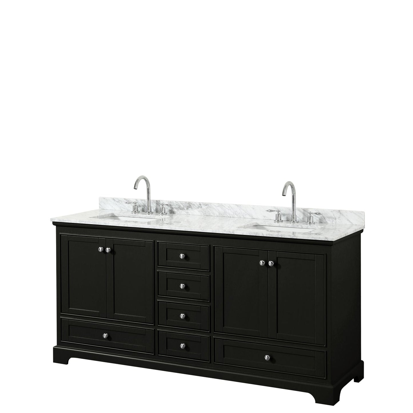 Wyndham Collection Deborah 72" Double Bathroom Vanity in Dark Espresso, White Carrara Marble Countertop, Undermount Square Sinks, and No Mirror