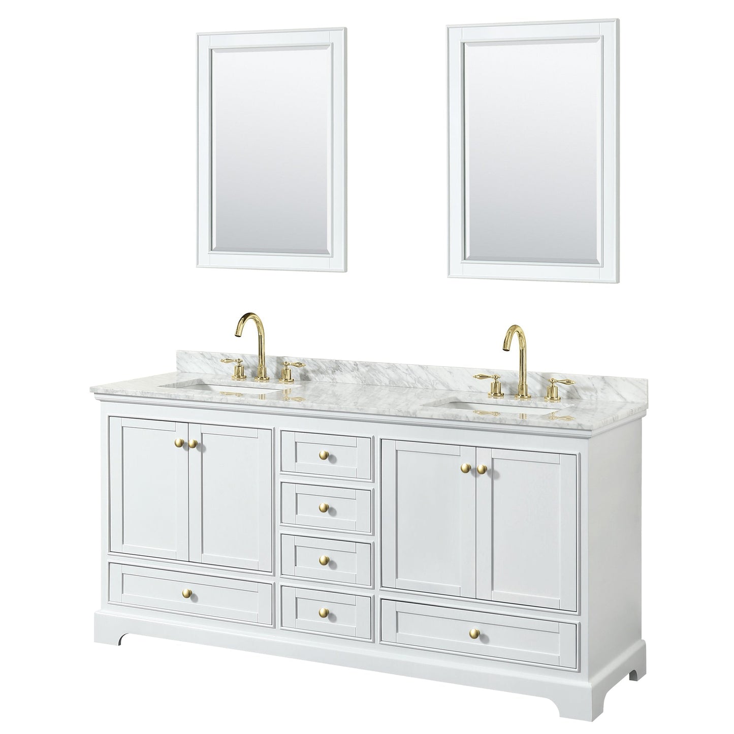 Wyndham Collection Deborah 72" Double Bathroom Vanity in White, White Carrara Marble Countertop, Undermount Square Sinks, Brushed Gold Trim, 24" Mirror