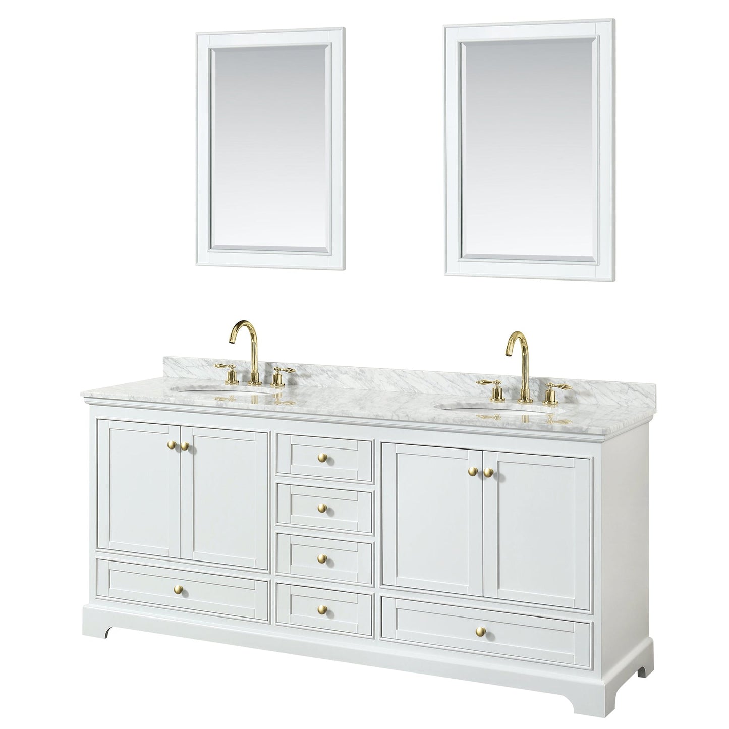 Wyndham Collection Deborah 80" Double Bathroom Vanity in White, White Carrara Marble Countertop, Undermount Oval Sinks, Brushed Gold Trim, 24" Mirror