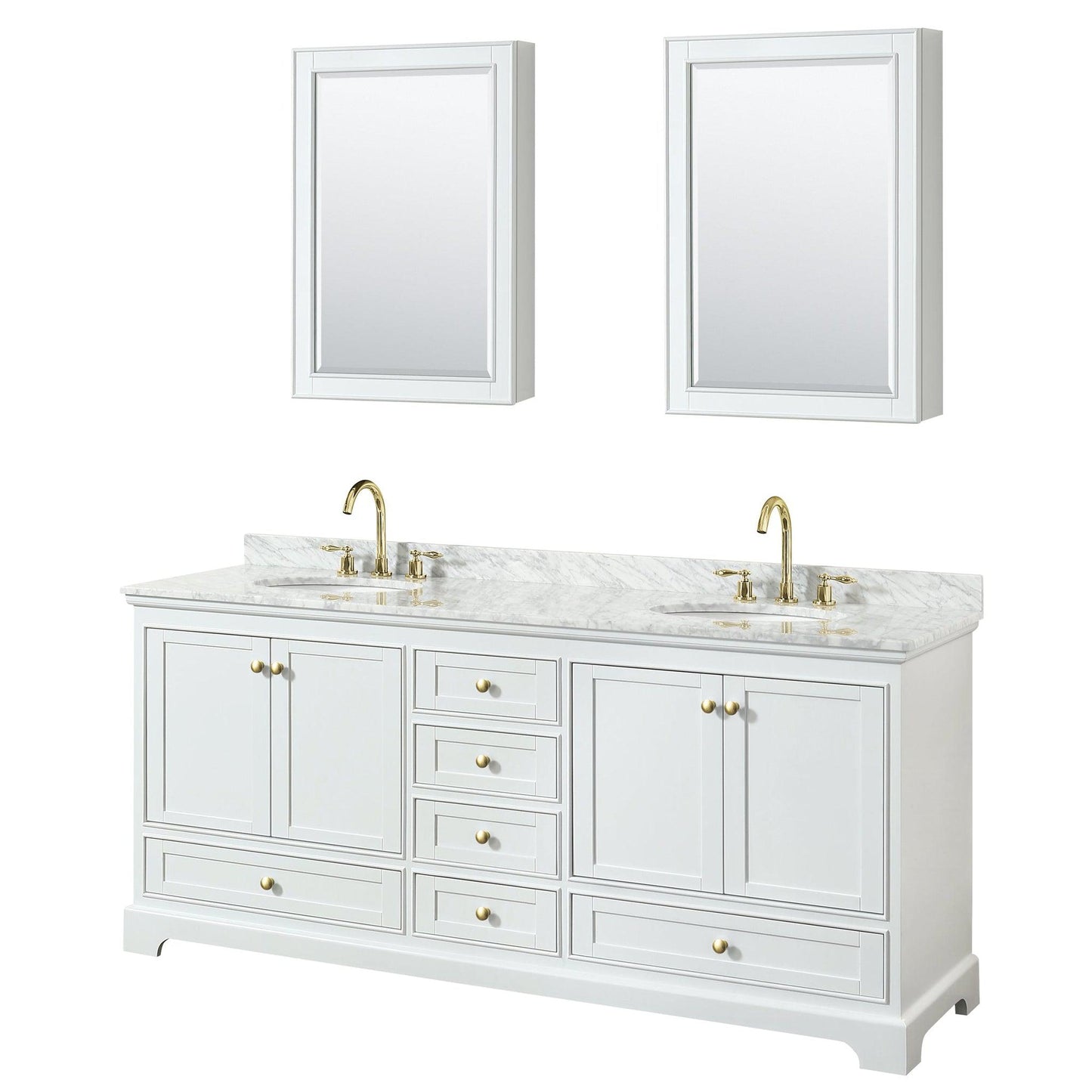 Wyndham Collection Deborah 80" Double Bathroom Vanity in White, White Carrara Marble Countertop, Undermount Oval Sinks, Brushed Gold Trim, Medicine Cabinet