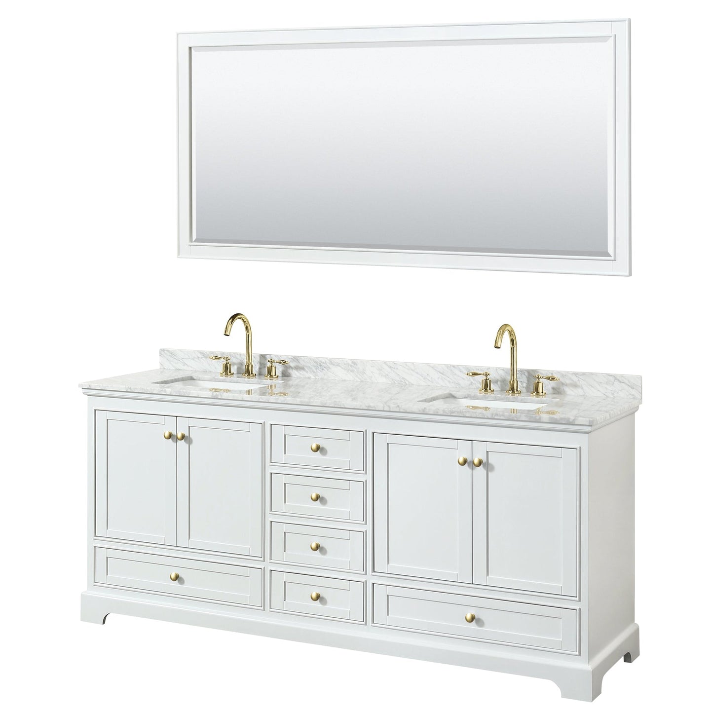Wyndham Collection Deborah 80" Double Bathroom Vanity in White, White Carrara Marble Countertop, Undermount Square Sinks, Brushed Gold Trim, 70" Mirror