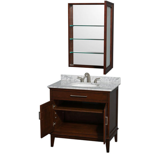 Wyndham Collection Hatton 36" Single Bathroom Vanity in Dark Chestnut, White Carrara Marble Countertop, Undermount Oval Sink, and Medicine Cabinet