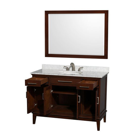 Wyndham Collection Hatton 48" Single Bathroom Vanity in Dark Chestnut, White Carrara Marble Countertop, Undermount Oval Sink, and 44" Mirror