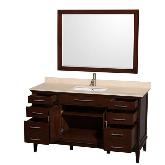 Wyndham Collection Hatton 60" Single Bathroom Vanity in Dark Chestnut, Ivory Marble Countertop, Undermount Square Sink, and 44" Mirror