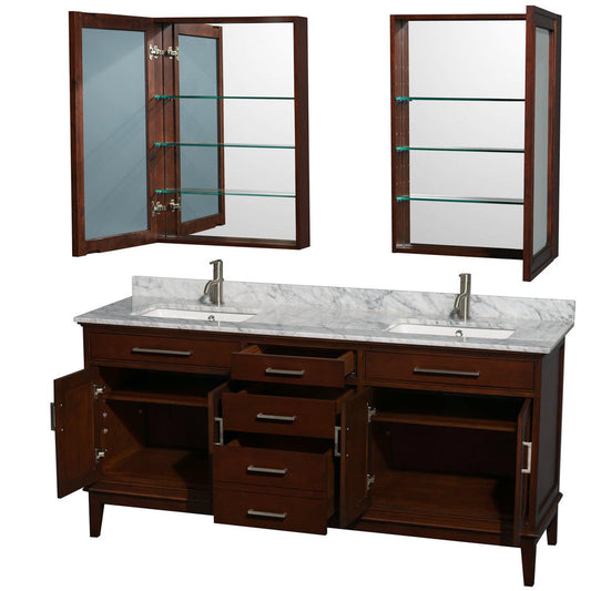 Wyndham Collection Hatton 72" Double Bathroom Vanity in Dark Chestnut, White Carrara Marble Countertop, Undermount Square Sinks, and Medicine Cabinet