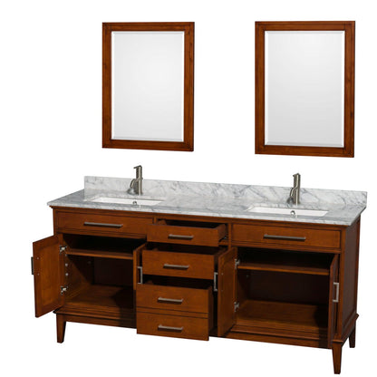 Wyndham Collection Hatton 72" Double Bathroom Vanity in Light Chestnut, White Carrara Marble Countertop, Undermount Square Sinks, and 24" Mirror
