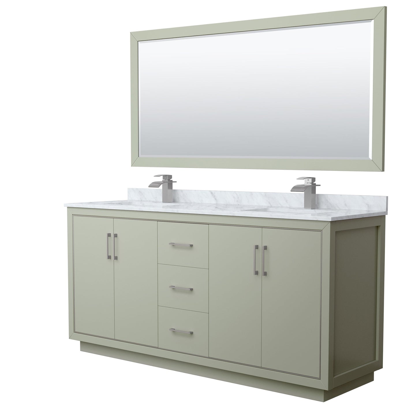 Wyndham Collection Icon 72" Double Bathroom Vanity in Light Green, White Carrara Marble Countertop, Undermount Square Sinks, Brushed Nickel Trim, 70" Mirror